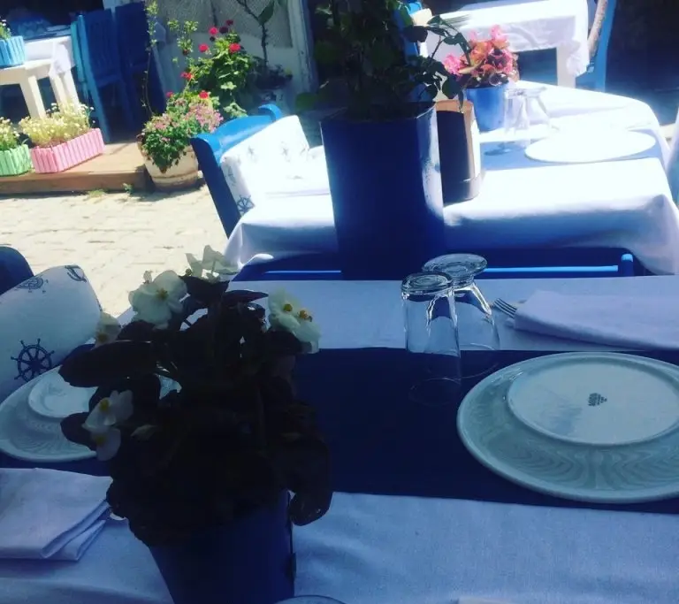 Sahil meyhanesi konsepti, beyaz masa ve sandalyeler, mavi runnerlar ve sandalye minderleri.