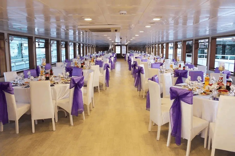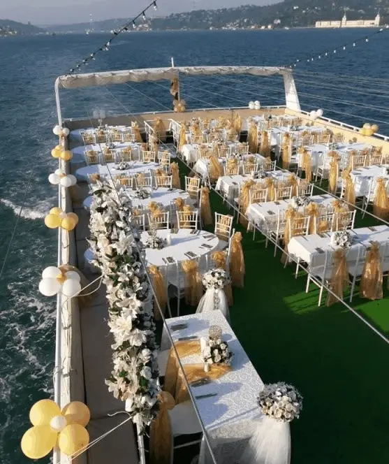 Boğaz ve şehir manzarası sunan teknede düğün için İstanbul'un farklı iskelelerinden yolcu almaktadır.