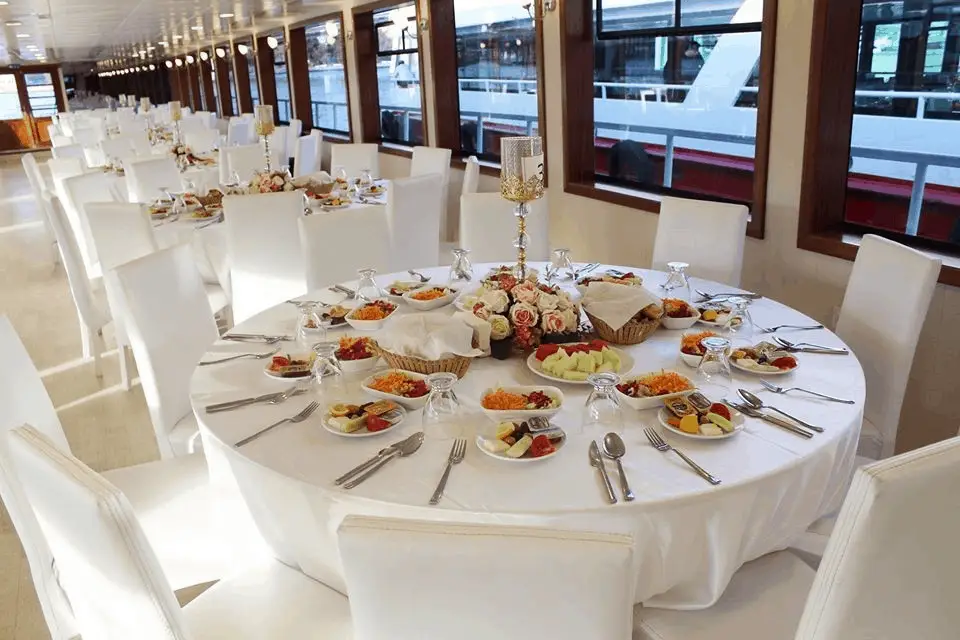 Yemek servisi hizmeti bulunan Adalı Tur bünyesinde, usta şefler tarafından hazırlanan menü seçenekleriyle damak zevkinize uygun lezzetler sunuluyor. Hazırlanan yemeklerle davetlileriniz en güzel şekilde ağırlanıyor. Menü tadımı ve menüde değişlik yapma seçeneğiniz de bulunuyor. Bu sayede istediğiniz tatları misafirlerinize sunabiliyorsunuz. Boğaz'da tekne düğünü gerçekleştirecek çiftlere her imkan sağlanıyor. Organizasyon sorumlusu, düğün günü planlamanızda size eşlik ediyor ve memnuniyetinizi en üst seviyede tutmaya özen gösteriyor. Mekanın dekorasyonuna, süslemelerine, düğün pastasına ve müziklere karar vermede sizinle birlikte çalışacak harika bir ekibi bulunuyor. Fotoğrafçısı ile en özel anlarınız ölümsüzleştiriliyor. Böylece fotoğraflara baktığınızda aynı güne dönüp, aynı heyecanı tekrar duyuyorsunuz. Bunlarla birlikte after party alan hazırlığı ile eğlencenize her zaman kaldığınız yerden devam etmeniz sağlanıyor.