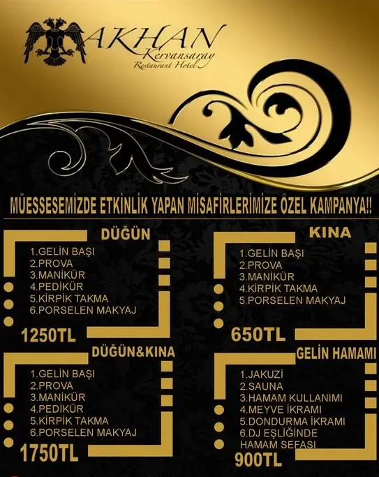 Akhan Kervansaray Düğün Salonları fiyatları hafta içi yemekli kişi başı ₺500,00 - hafta sonu yemeksiz paket fiyatı ₺80.000,00 - hafta sonu yemekli kişi başı ₺750,00