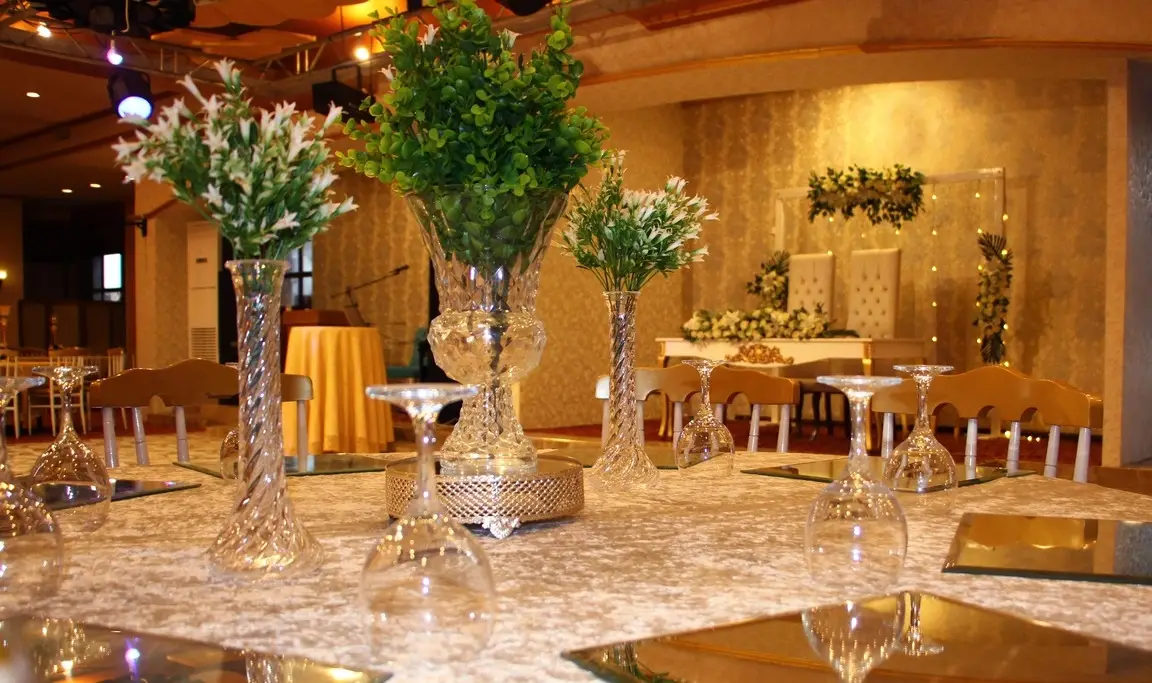 Sofistike bir atmosfer sunan salonumuz, bej ve kahverengi tonlarının yanı sıra dikkat çekici kırmızı zemin detayları ile bezeli. Dore detaylı şık tasarım sandalyelerimiz ve yuvarlak banket masalarımızla, masaları düğün konseptine uygun çiçeklerle ve süslemelerle donatıyor, çiftlerimize önceden görebilecekleri teşhir masası da sunuyoruz.