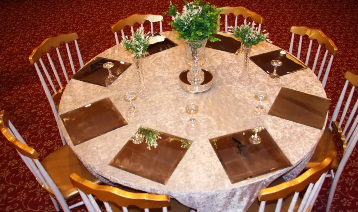 Dekorasyonumuzda bej ve kahverengi tonlarının üzerine kırmızı zemin ve dore detaylı sandalyeler öne çıkar; yuvarlak banket masalar konsepte uygun çiçeklerle süslenir.