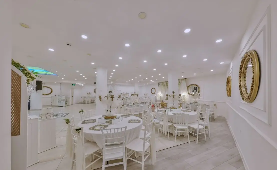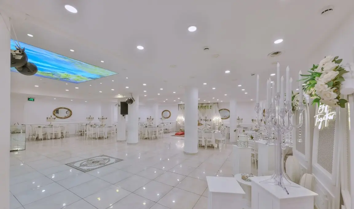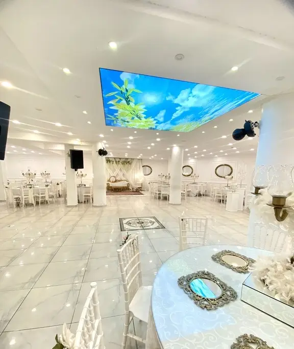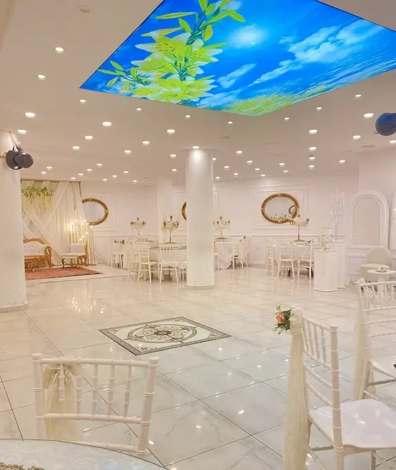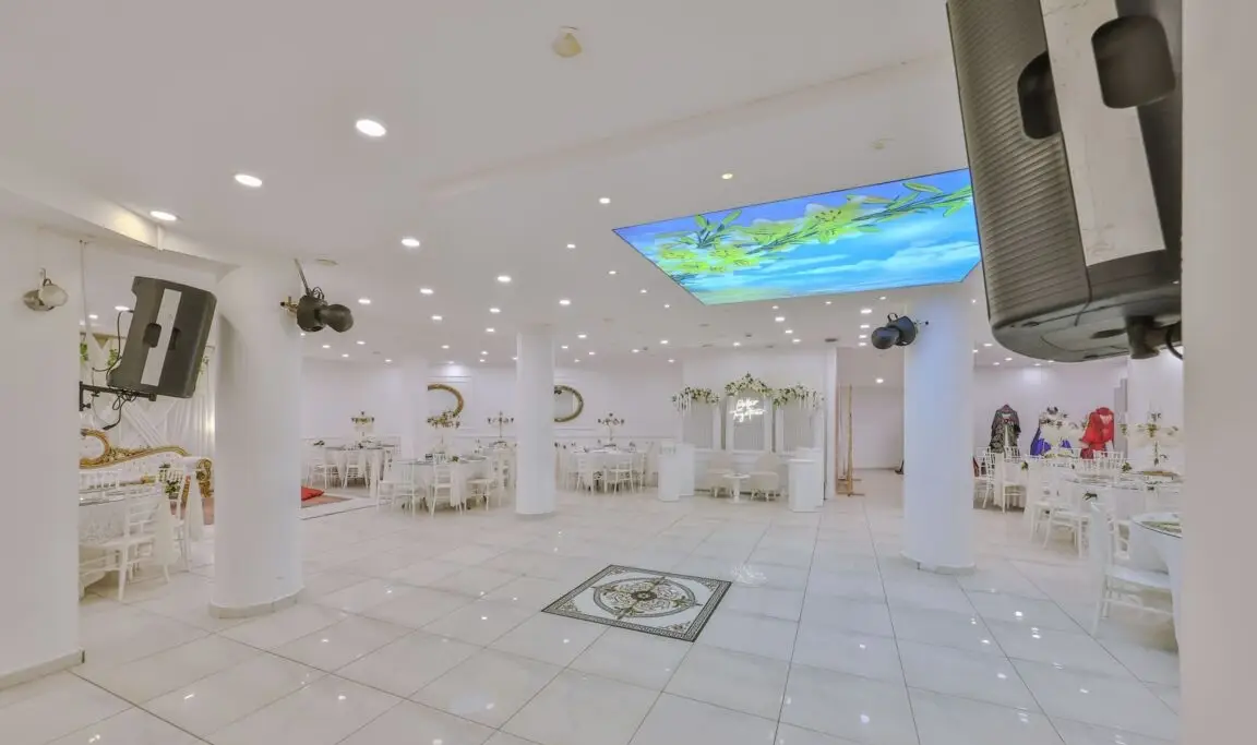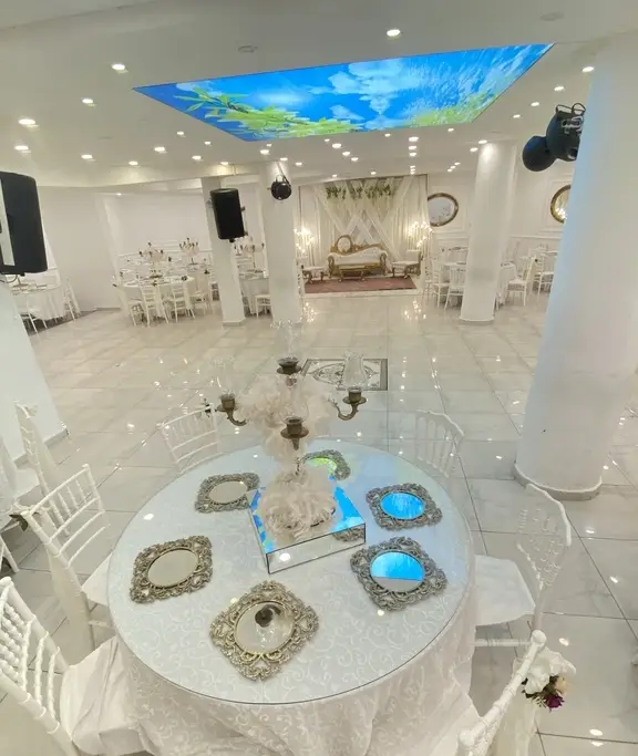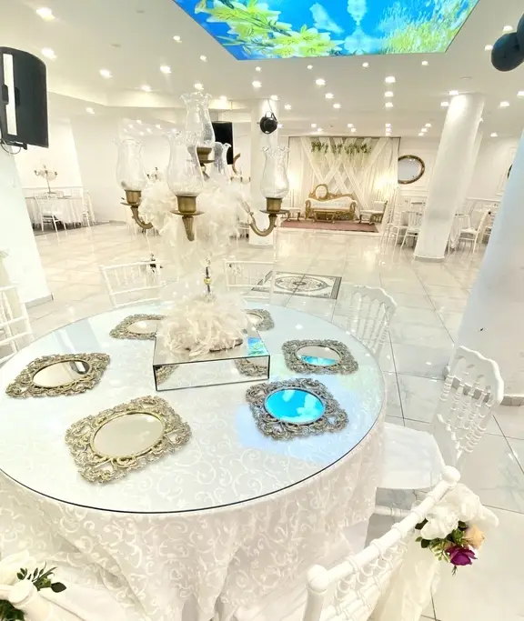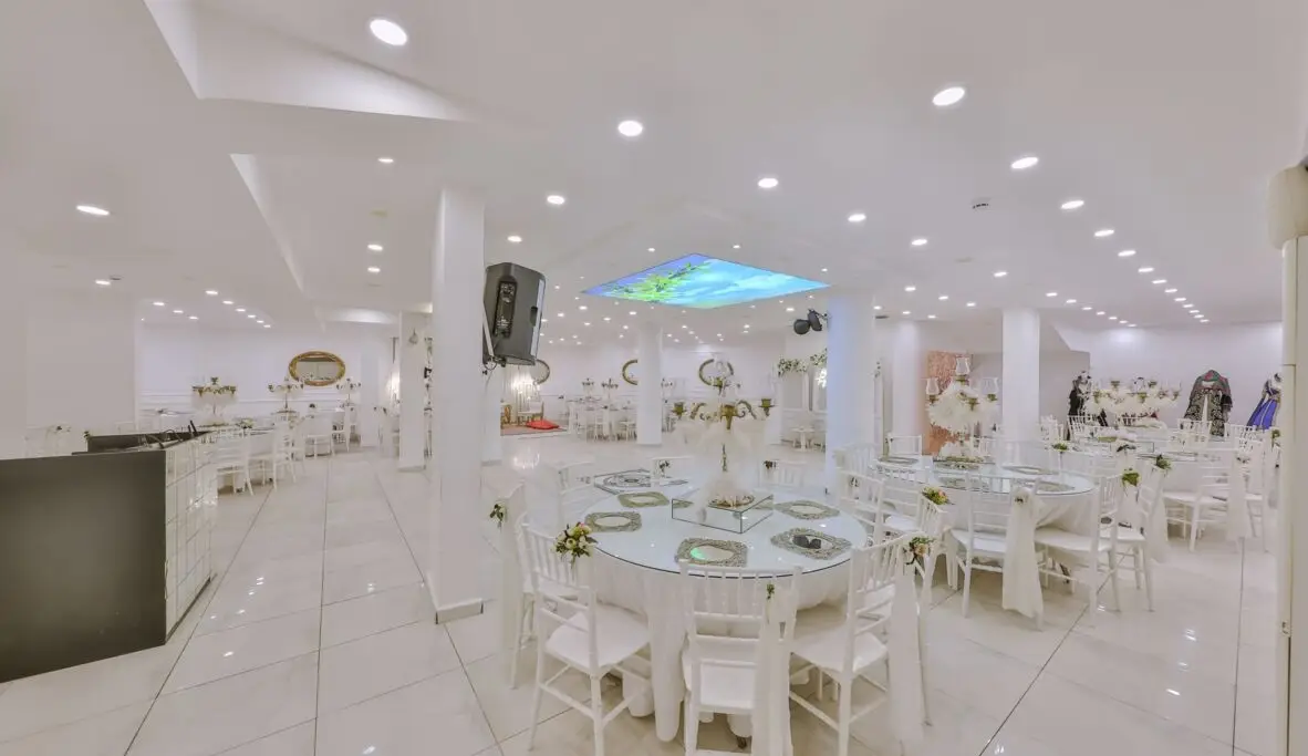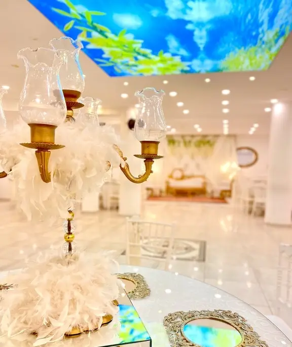 Zarif dekorasyonu ile dikkat çekici bir atmosfer sunan mekanımızda, aydınlık ve ferah bir ortam yaratmak için spot ışıklandırmalar ve gökyüzü temalı süslemeler kullanıyoruz. İster romantik ister modern bir konsept seçin, rustik dokunuşlarla süslediğimiz nişan masası ve şık Tiffany sandalyelerle özel gününüzü kutlayabilirsiniz.