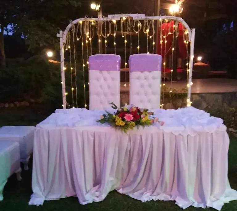 Beyaz sandalyelerimize kırmızı, sarı, lila ve gümüş rengi giydirmelerimiz var. Ayna, kristal şamdan ve mumlarla süslenen şık masalar sunuyoruz.