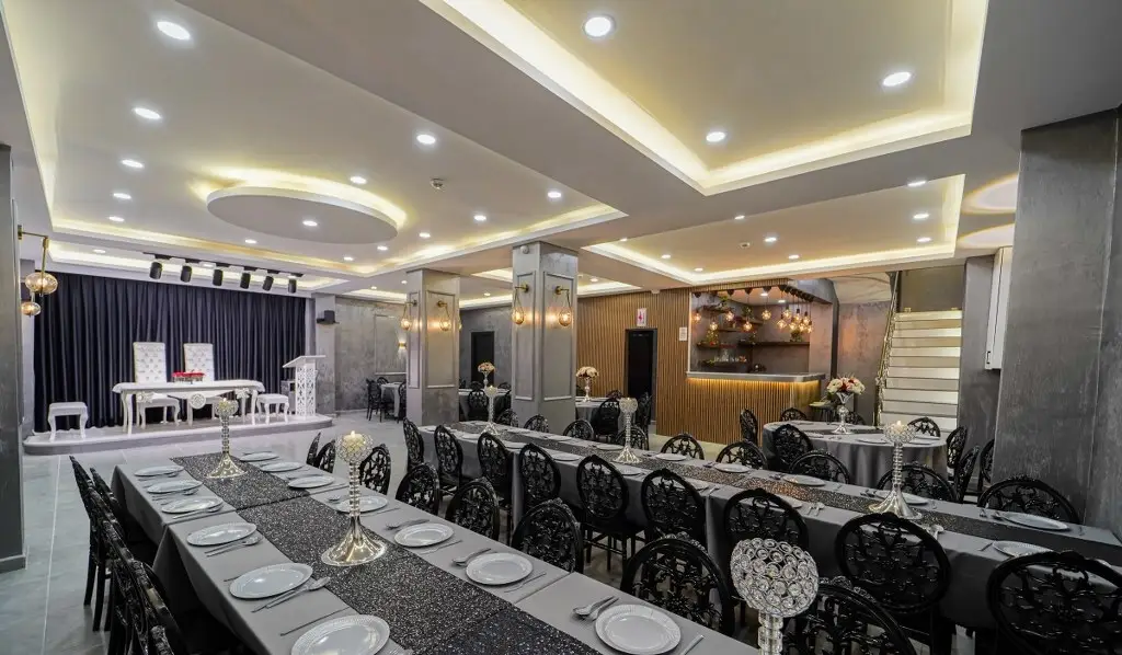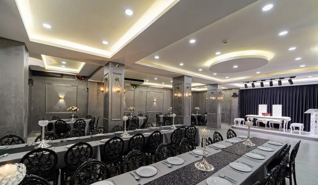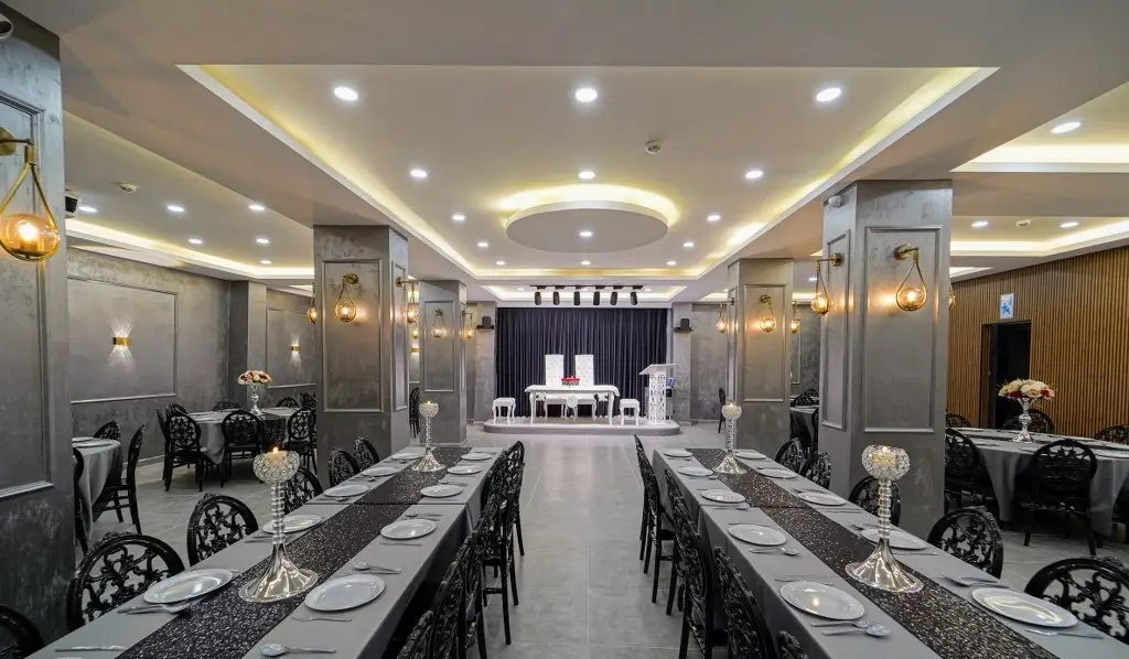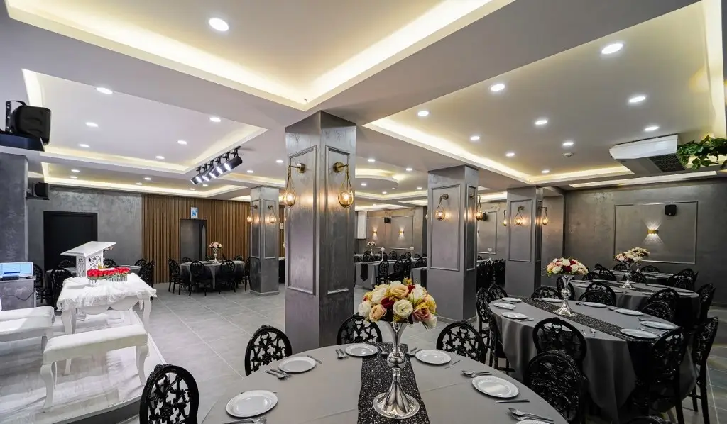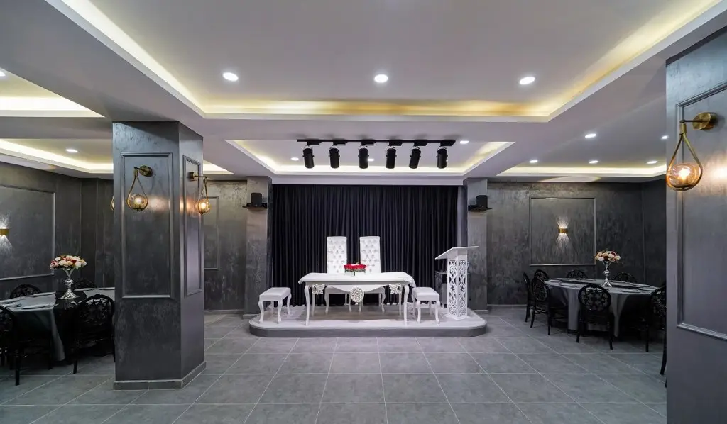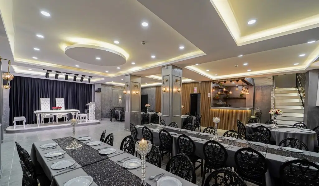 Dekorasyon için siyah/gold veya gri/siyah renk temaları, nozze model zarif sandalyeler, kristal mumluklar ve çiçek buketleriyle süslenen masa üstleri mevcuttur.