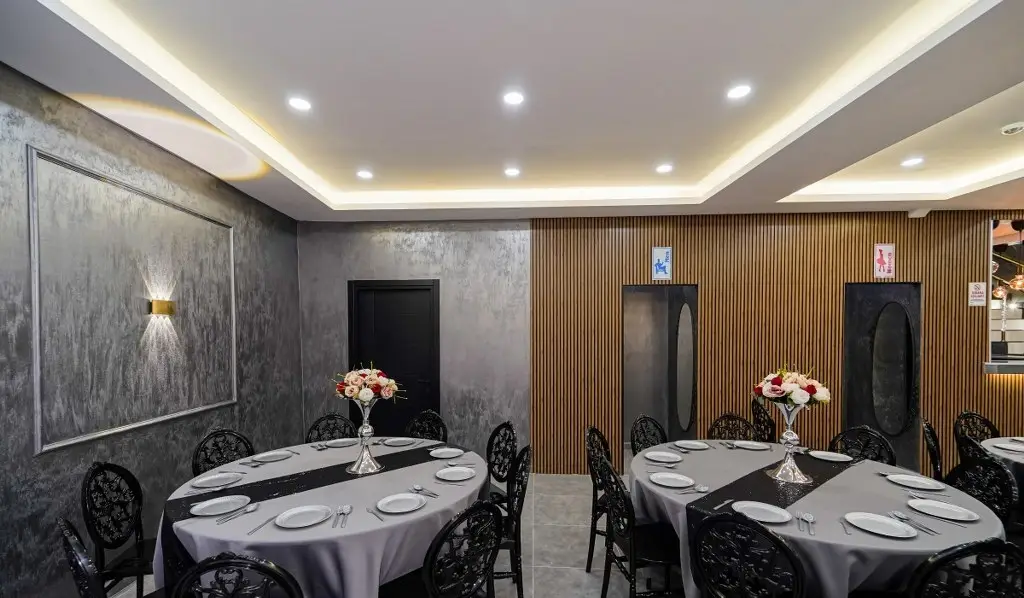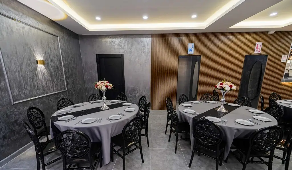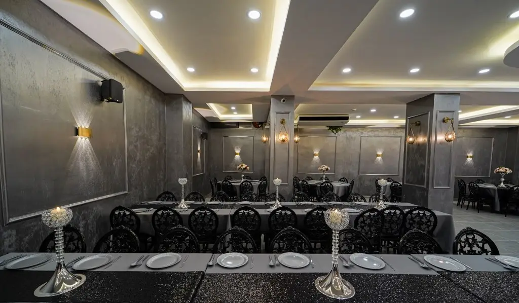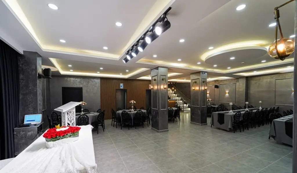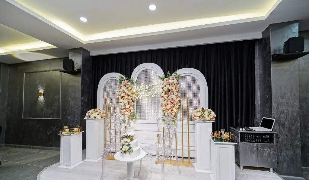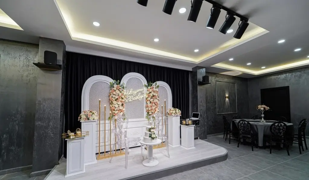 Dekorasyon için siyah/gold veya gri/siyah renk temaları, nozze model zarif sandalyeler, kristal mumluklar ve çiçek buketleriyle süslenen masa üstleri mevcuttur.