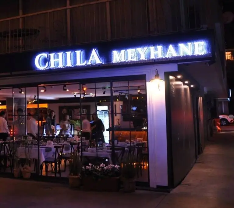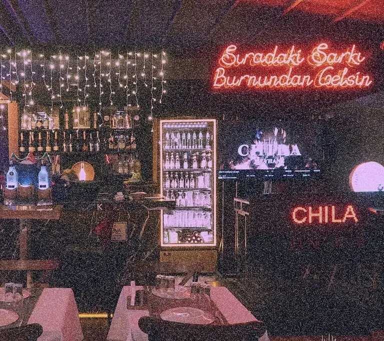 Chila Meyhane, doğal ahşap dokunuşları ve modern tasarımı ile şıklığı ve sıcaklığı bir araya getirir. Neon yazılar ve nostaljik duvar boyamalarıyla dinamik bir atmosfer yaratırken, zarif detaylar ile mekâna özel bir zarafet katıyor.