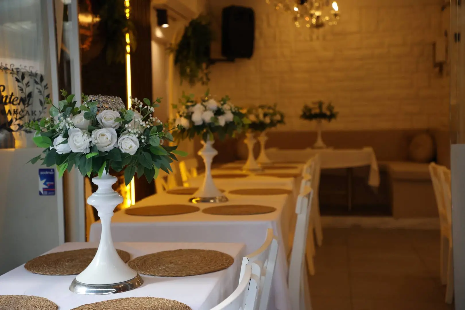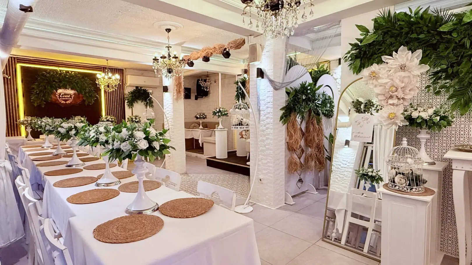 Salon yüksek tavan mimarisiyle ferah bir atmosfer oluşturuyor. Modern ışıklandırmalar, zarif masa süslemeleri ve şamdan, supla, yapay çiçek dekorları gibi detaylar etkinliğe estetik bir dokunuş katıyor. Mekan hem konsept tasarımı hem de dekorasyon düzenlemeleriyle farklı temalara uyum sağlayabiliyor.