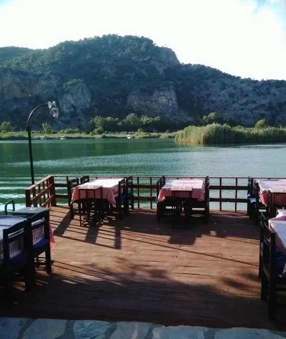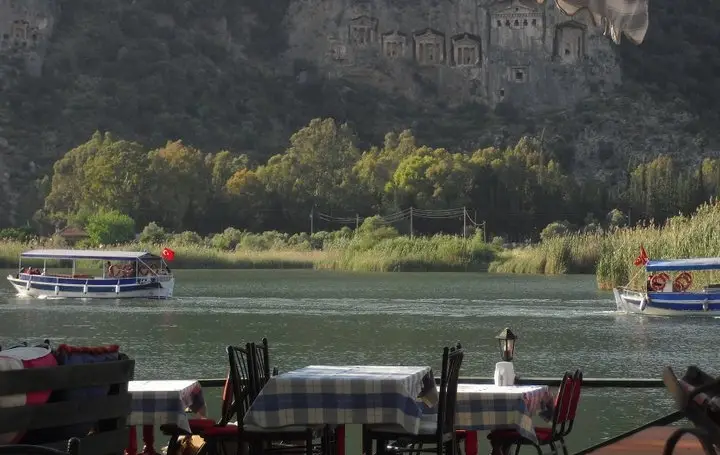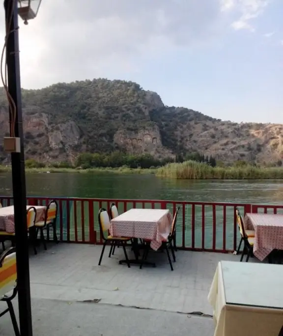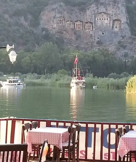 Likya Kaya Mezarları'na karşı konumlanmış, doğayla iç içe.
