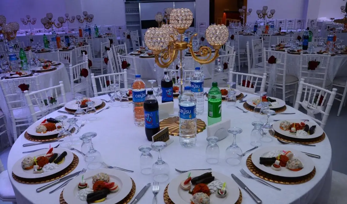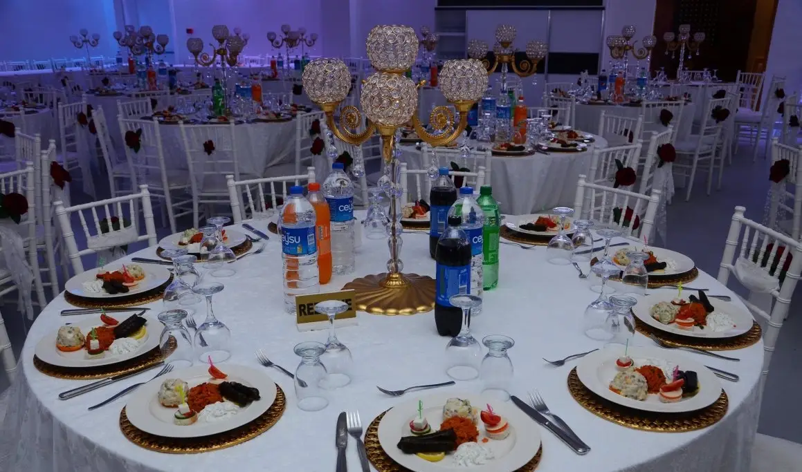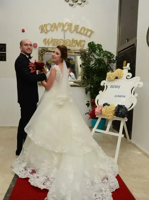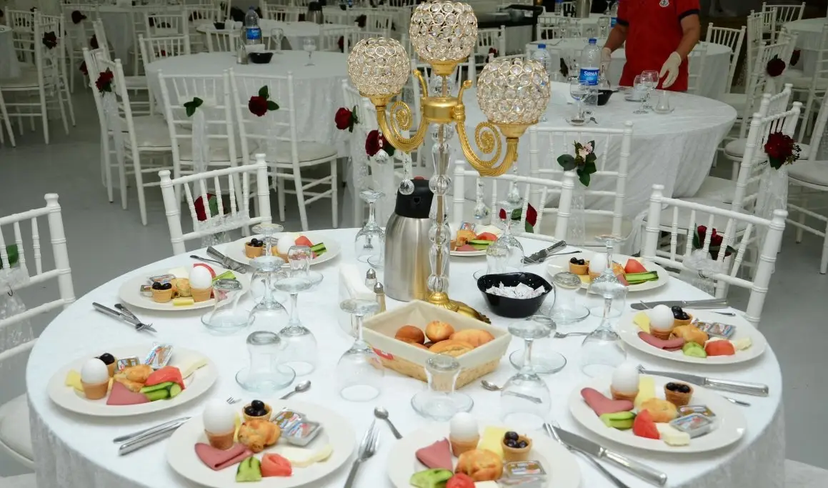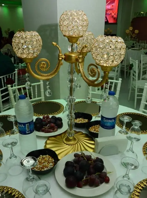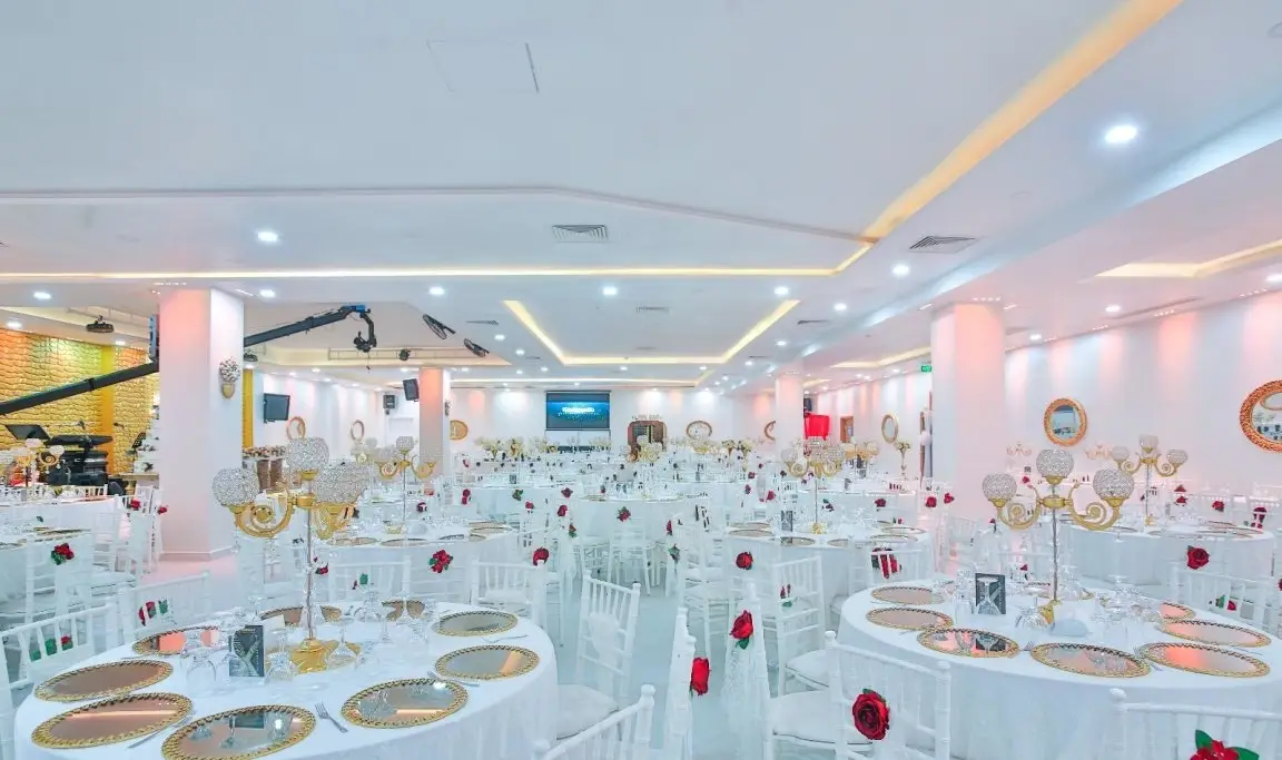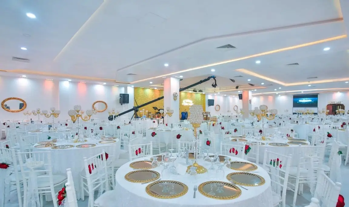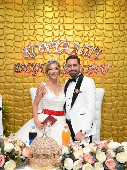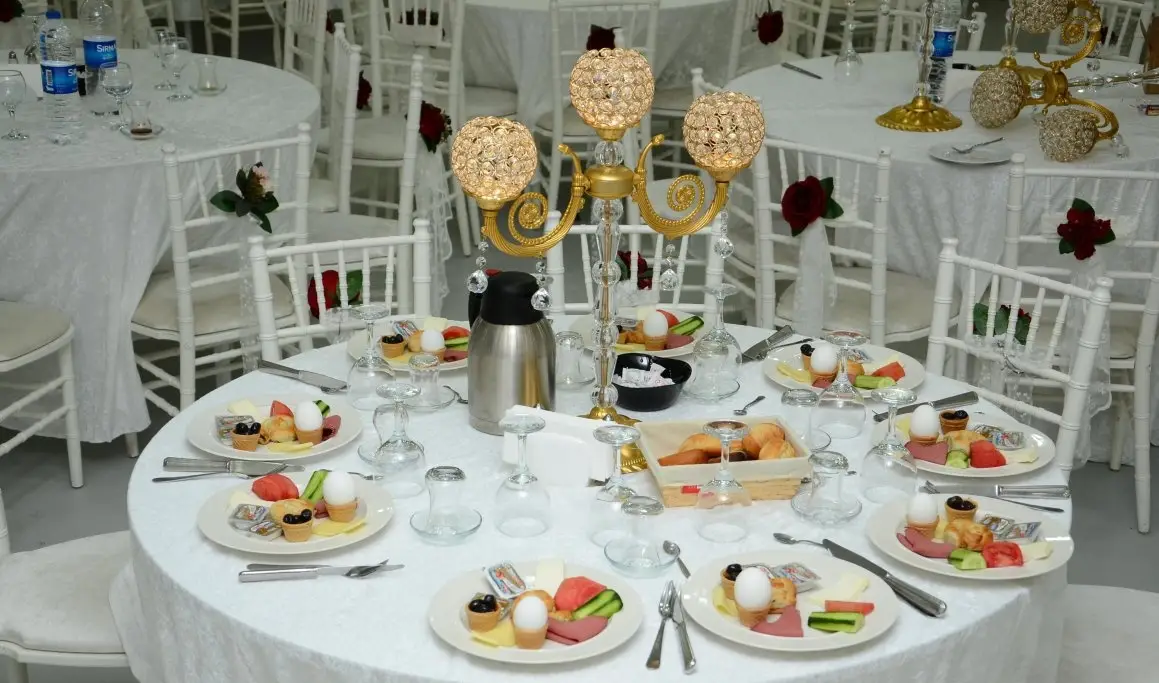 Beyaz ve gold renk uyumu ön plana çıkarılarak, yuvarlak masalar beyaz dantel işlemeli örtüler, altın pleksi suplalar ve kristal boncuklu şamdanlarla süslenmiştir. Beyaz tiffany sandalyeler kırmızı güllerle, gold vazo şeklindeki gelin yolu aksesuarları ve gold varaklı aynalarla dekorasyon tamamlanmıştır.