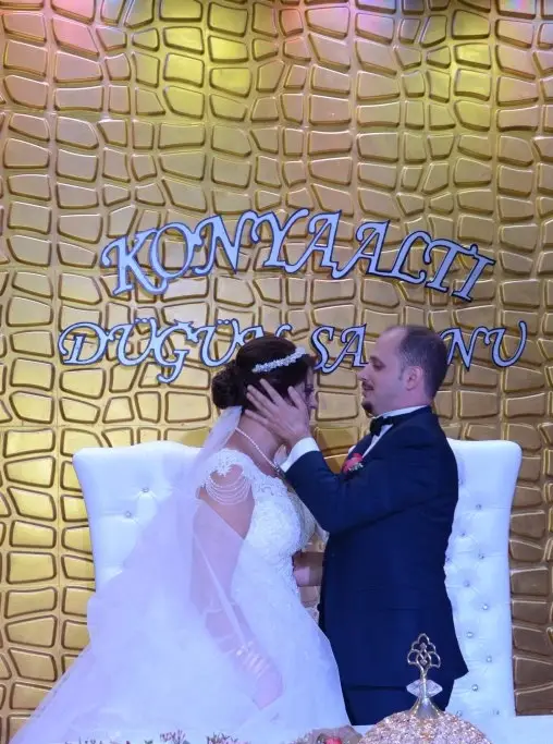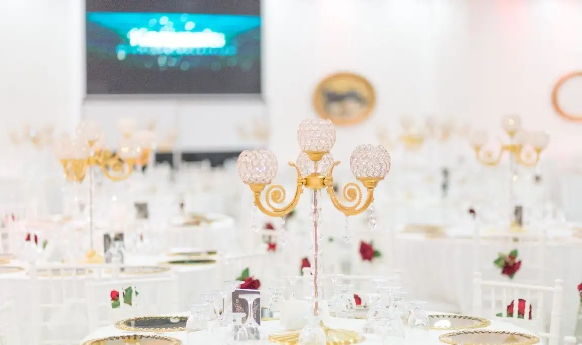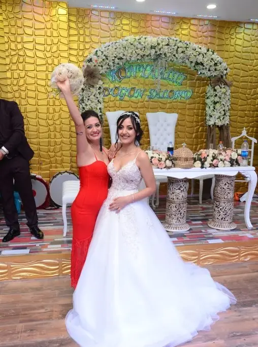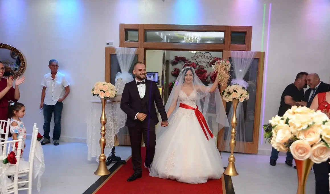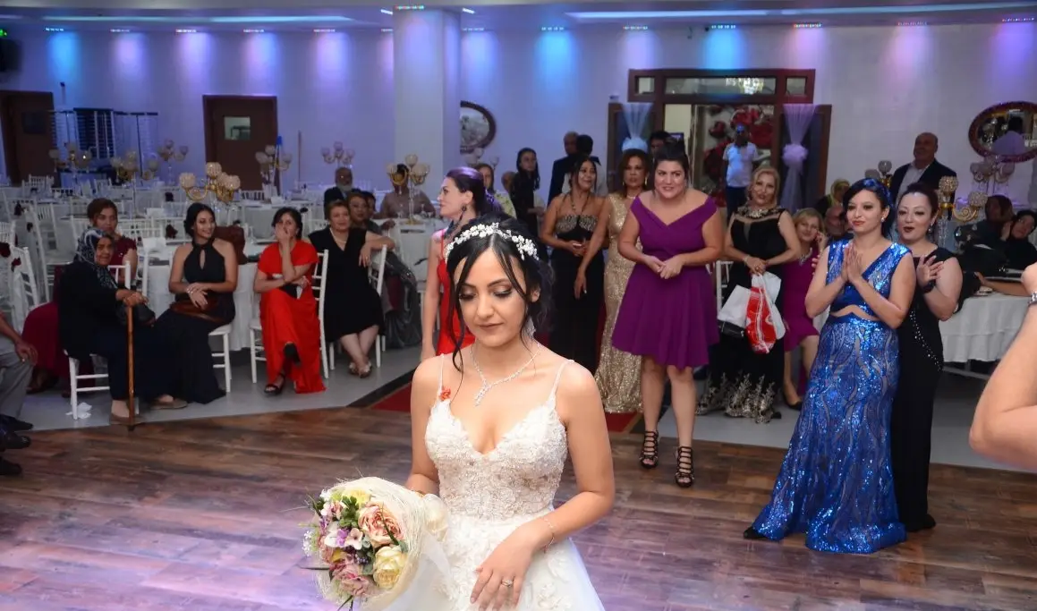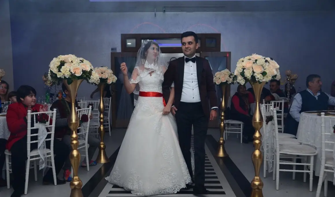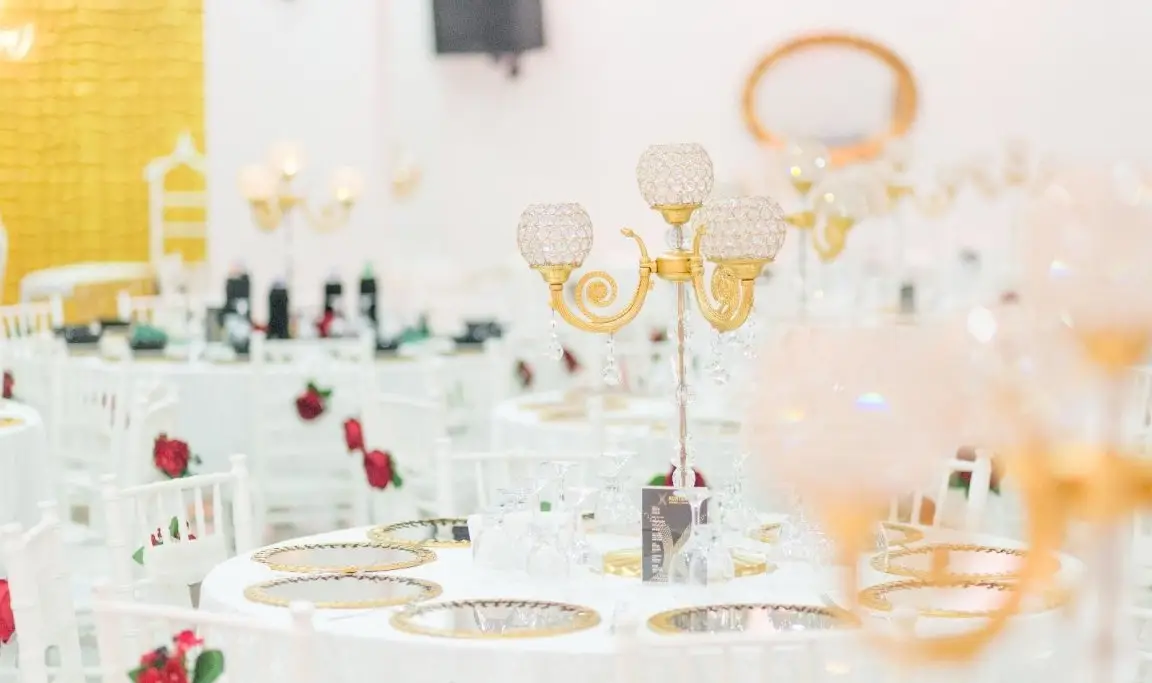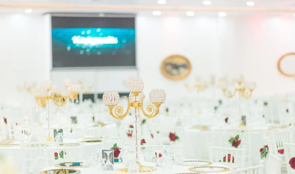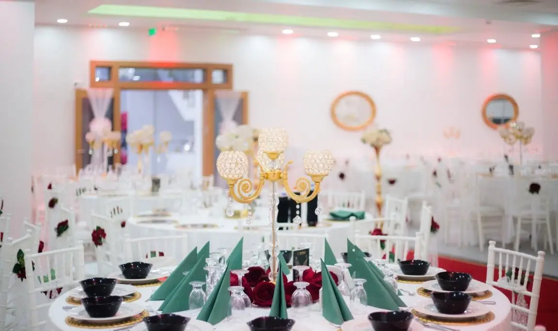 Beyaz ve gold renk uyumu ön plana çıkarılarak, yuvarlak masalar beyaz dantel işlemeli örtüler, altın pleksi suplalar ve kristal boncuklu şamdanlarla süslenmiştir. Beyaz tiffany sandalyeler kırmızı güllerle, gold vazo şeklindeki gelin yolu aksesuarları ve gold varaklı aynalarla dekorasyon tamamlanmıştır.