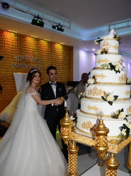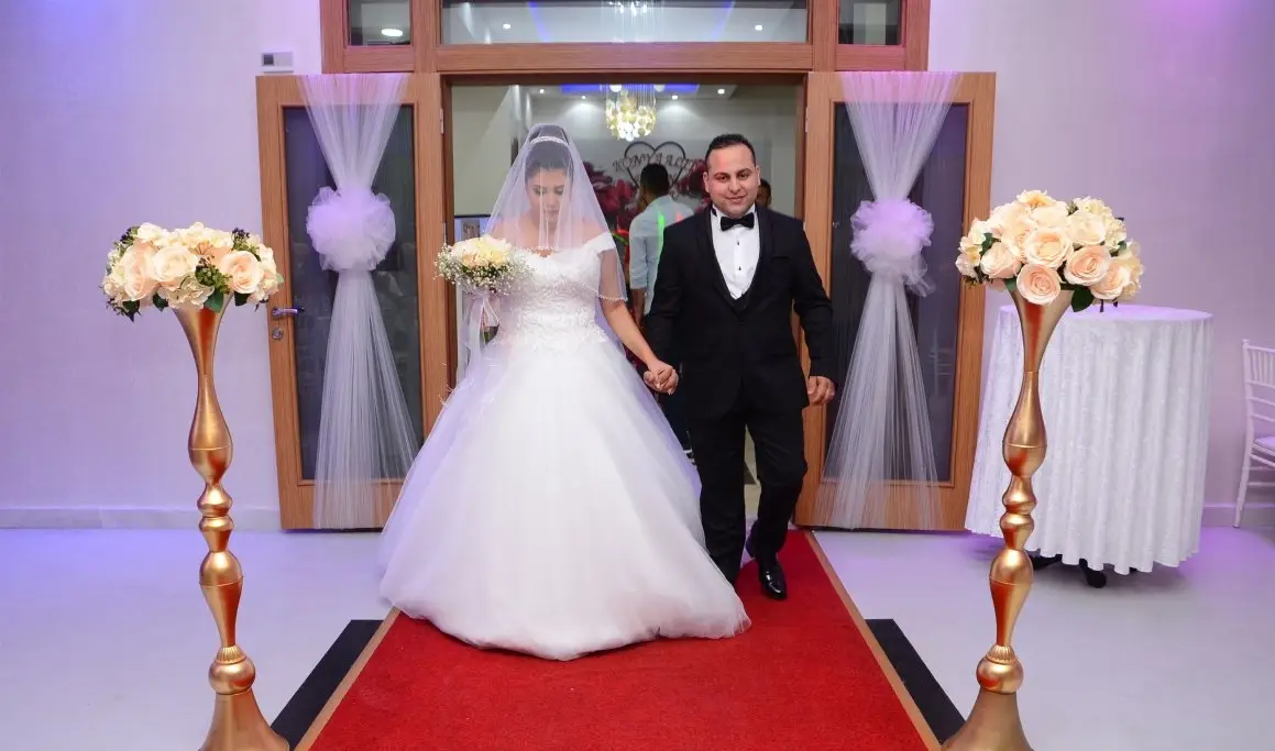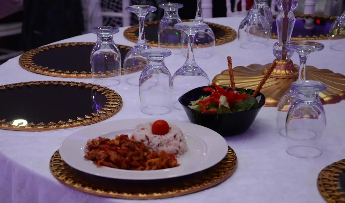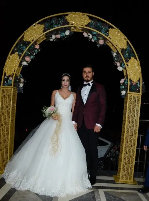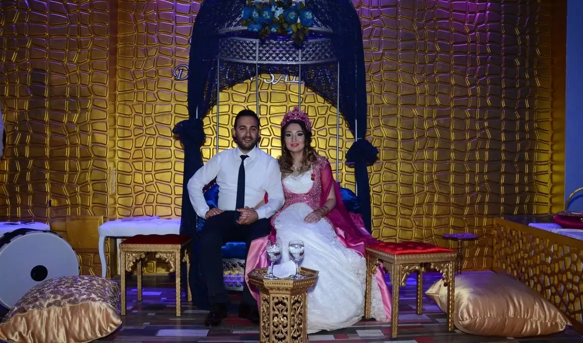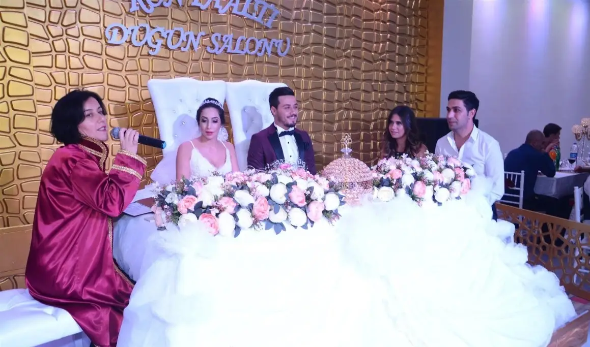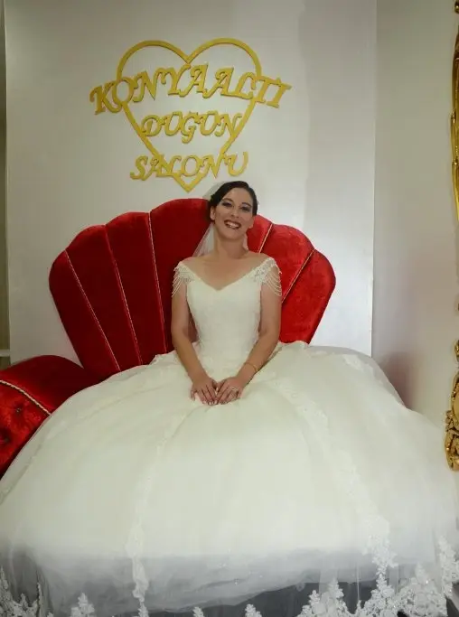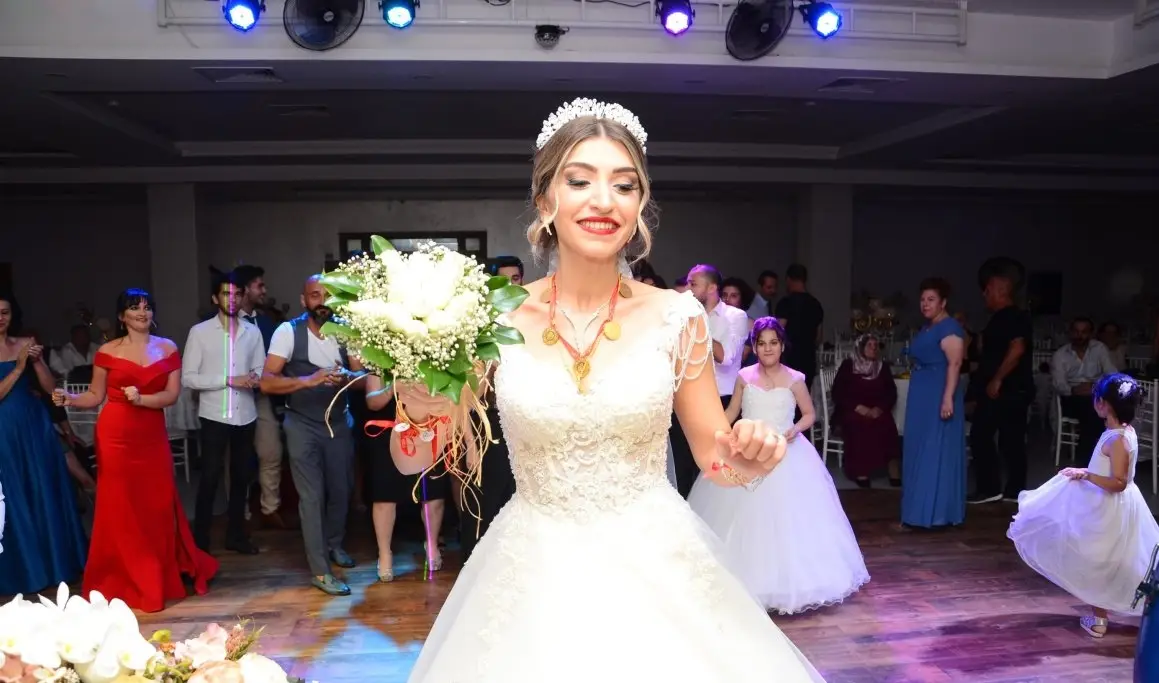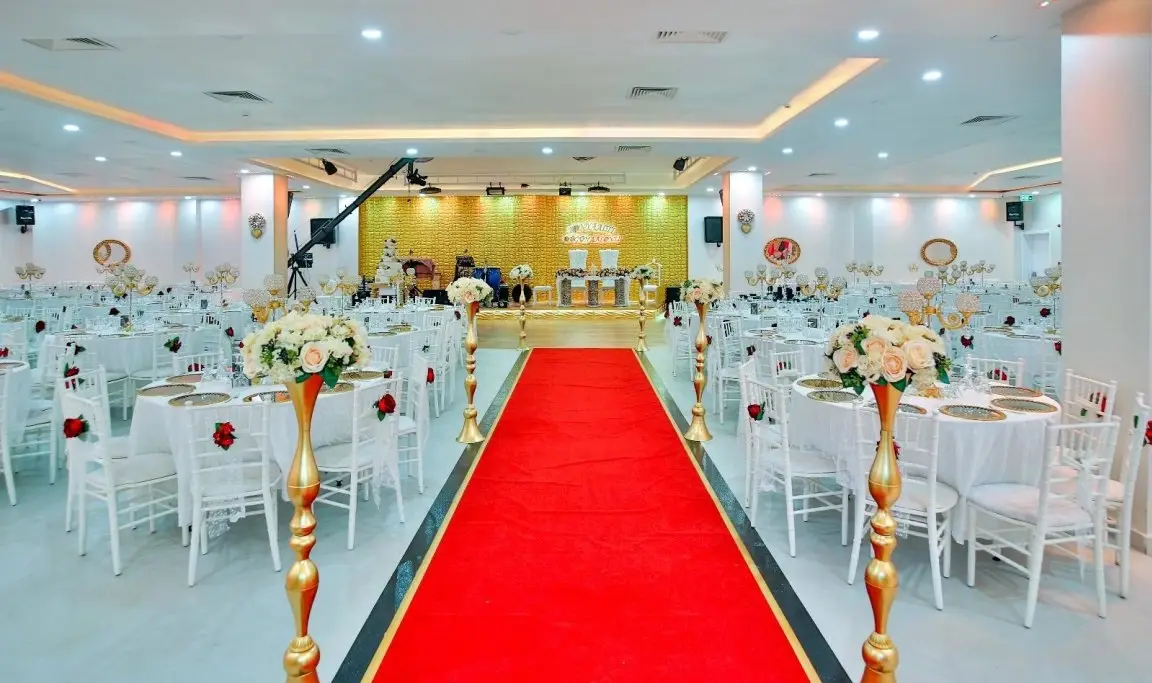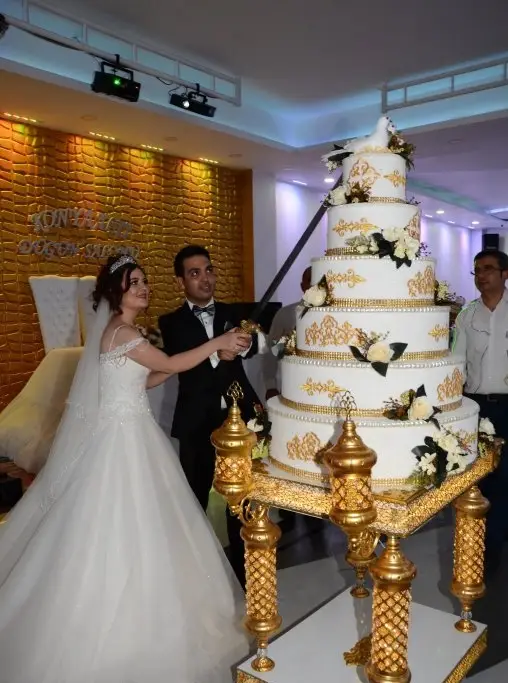 Beyaz ve gold renk uyumu ön plana çıkarılarak, yuvarlak masalar beyaz dantel işlemeli örtüler, altın pleksi suplalar ve kristal boncuklu şamdanlarla süslenmiştir. Beyaz tiffany sandalyeler kırmızı güllerle, gold vazo şeklindeki gelin yolu aksesuarları ve gold varaklı aynalarla dekorasyon tamamlanmıştır.