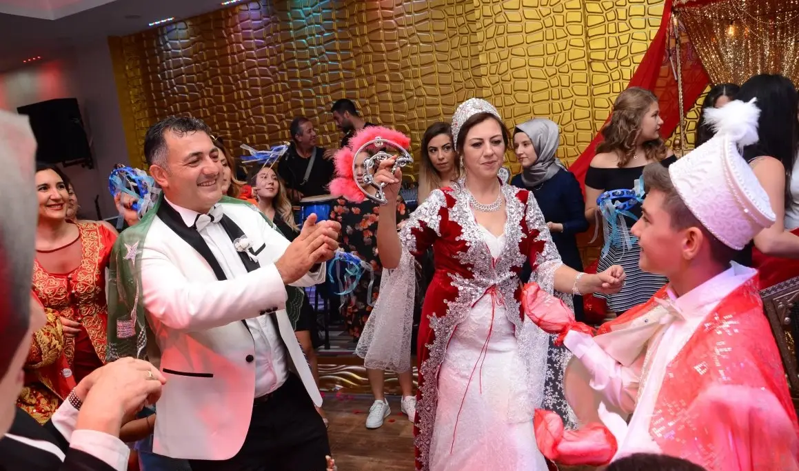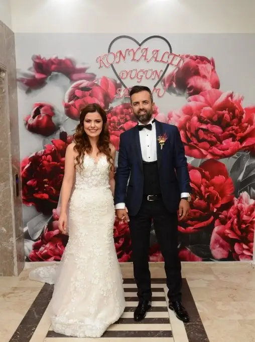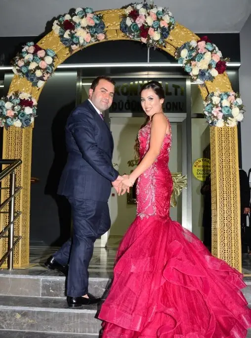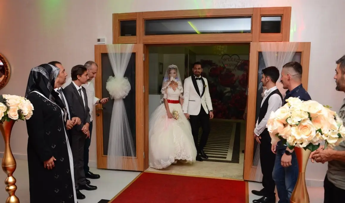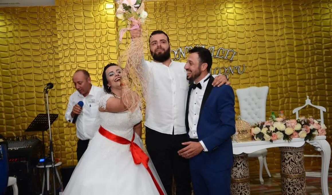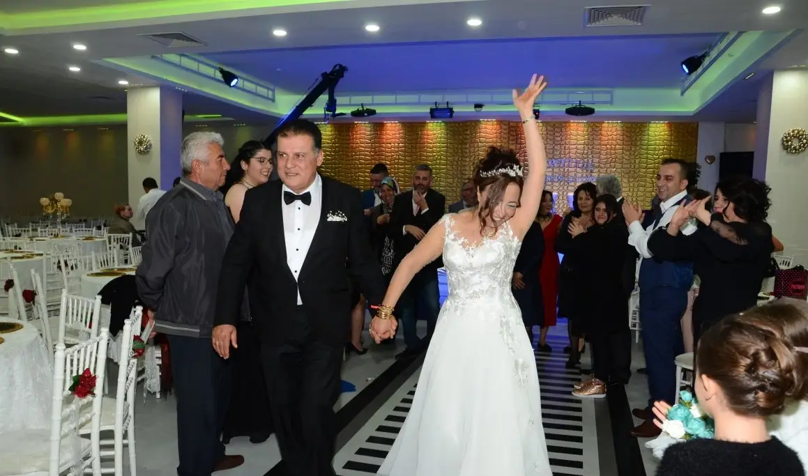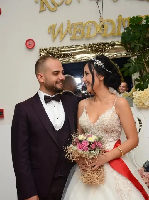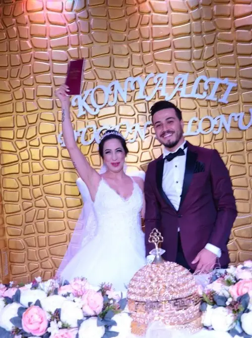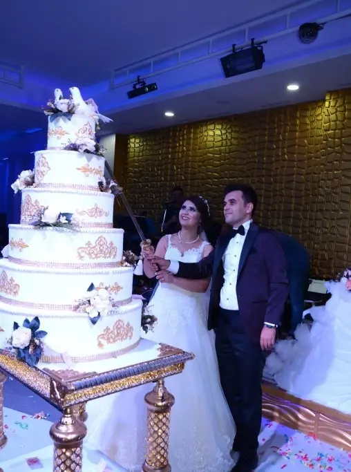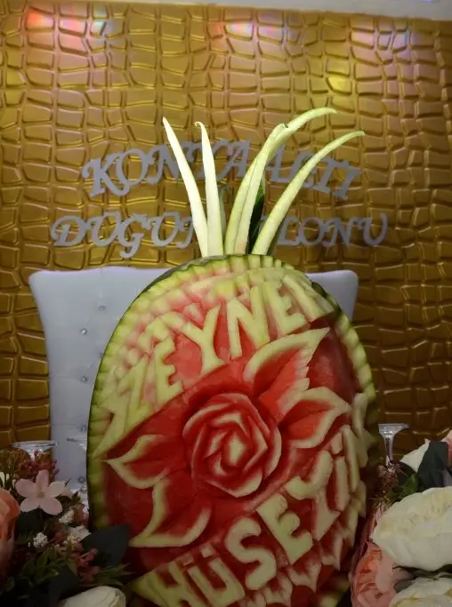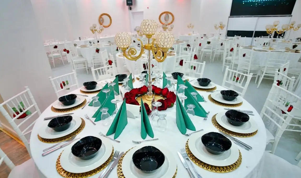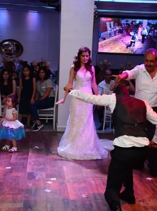 Beyaz ve gold renk uyumu ön plana çıkarılarak, yuvarlak masalar beyaz dantel işlemeli örtüler, altın pleksi suplalar ve kristal boncuklu şamdanlarla süslenmiştir. Beyaz tiffany sandalyeler kırmızı güllerle, gold vazo şeklindeki gelin yolu aksesuarları ve gold varaklı aynalarla dekorasyon tamamlanmıştır.