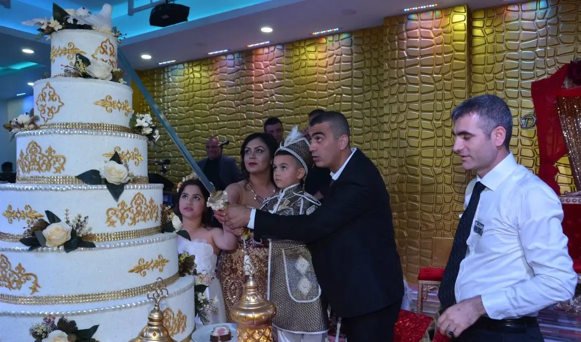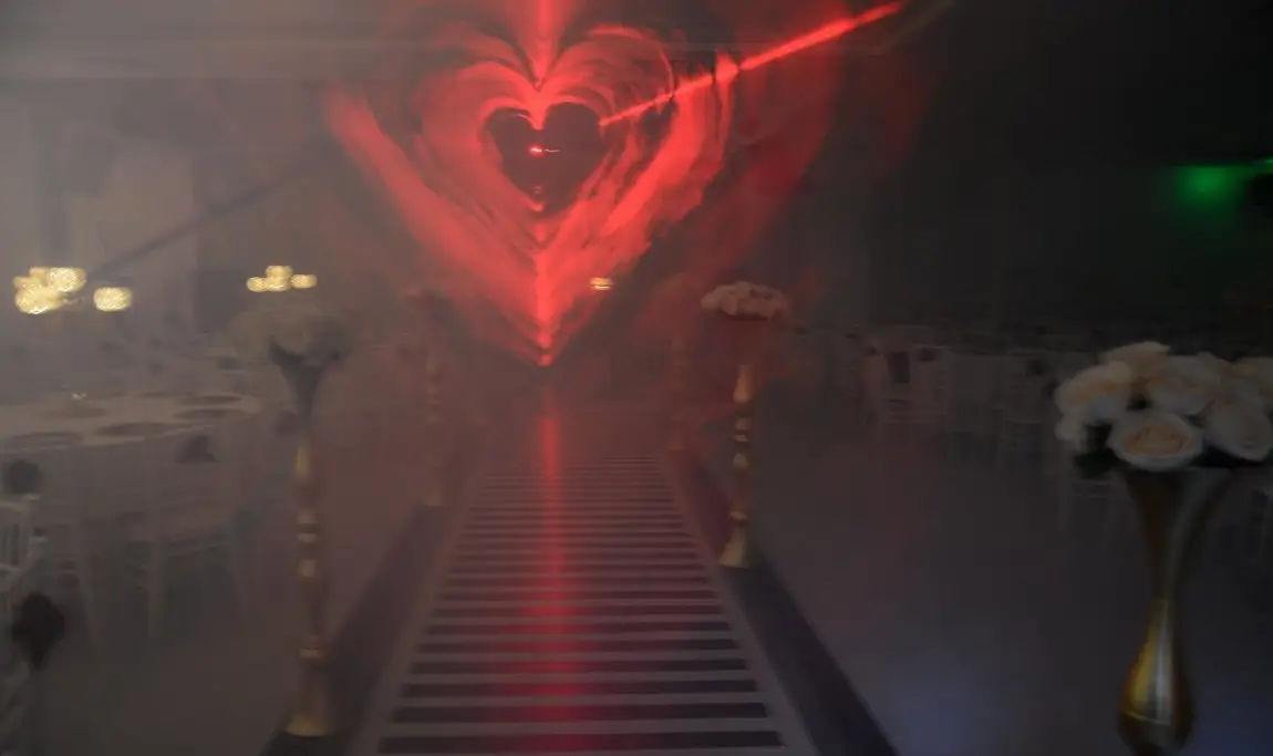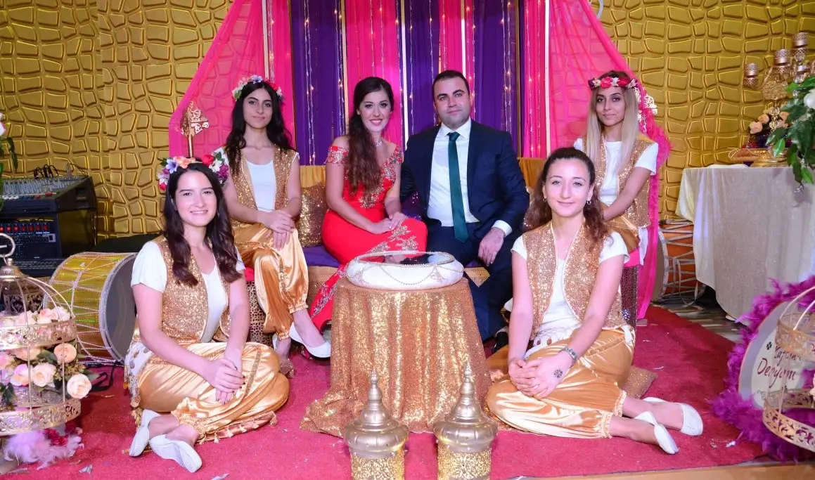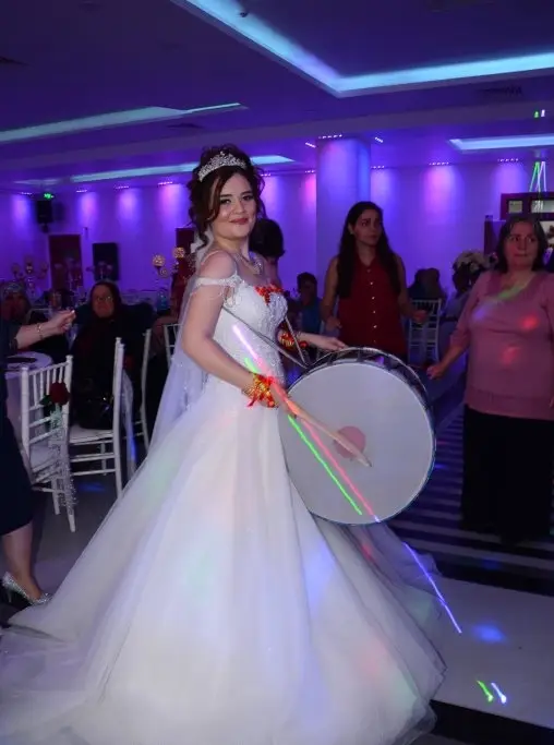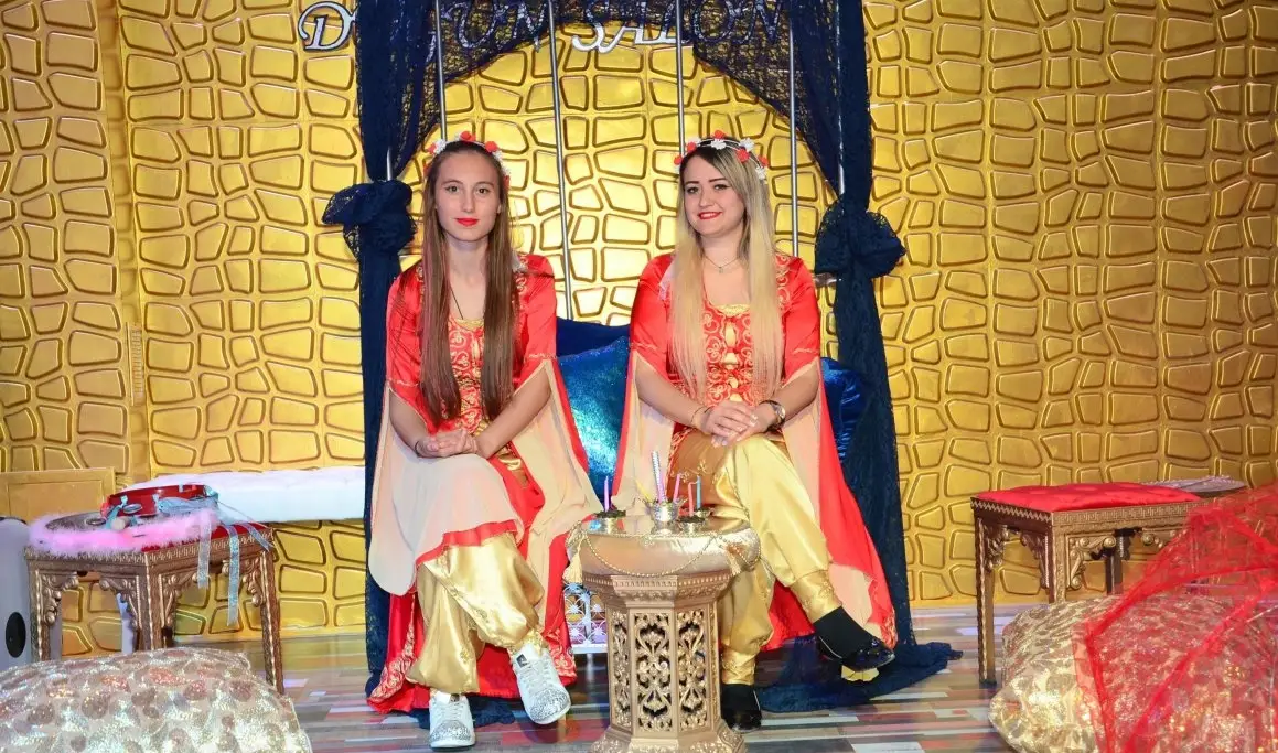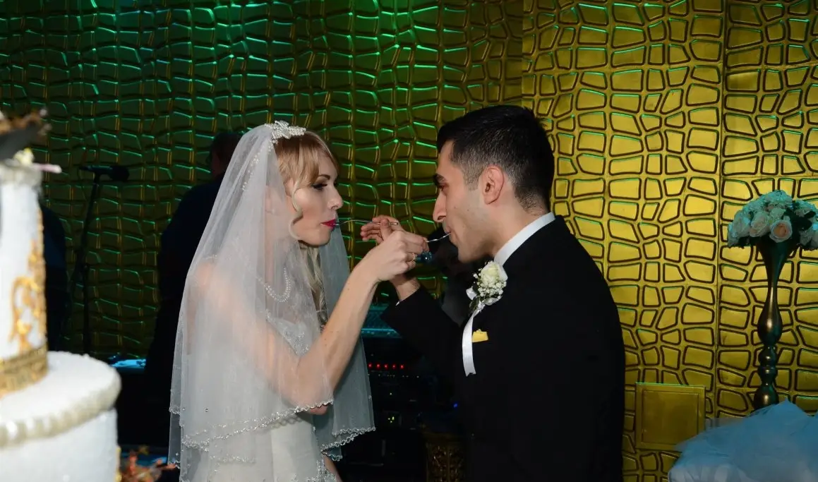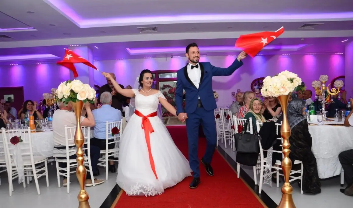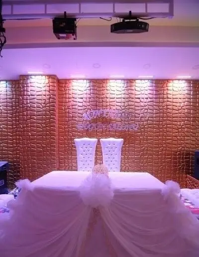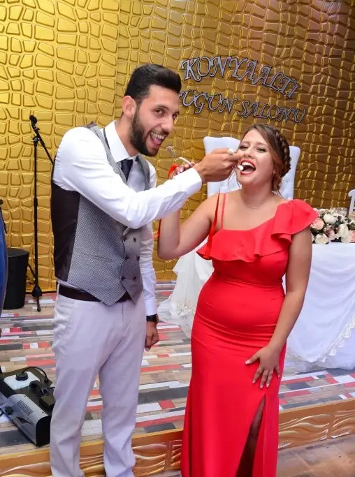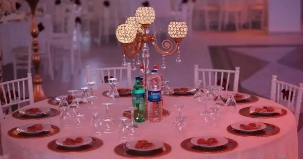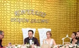 Beyaz ve gold renk uyumu ön plana çıkarılarak, yuvarlak masalar beyaz dantel işlemeli örtüler, altın pleksi suplalar ve kristal boncuklu şamdanlarla süslenmiştir. Beyaz tiffany sandalyeler kırmızı güllerle, gold vazo şeklindeki gelin yolu aksesuarları ve gold varaklı aynalarla dekorasyon tamamlanmıştır.
