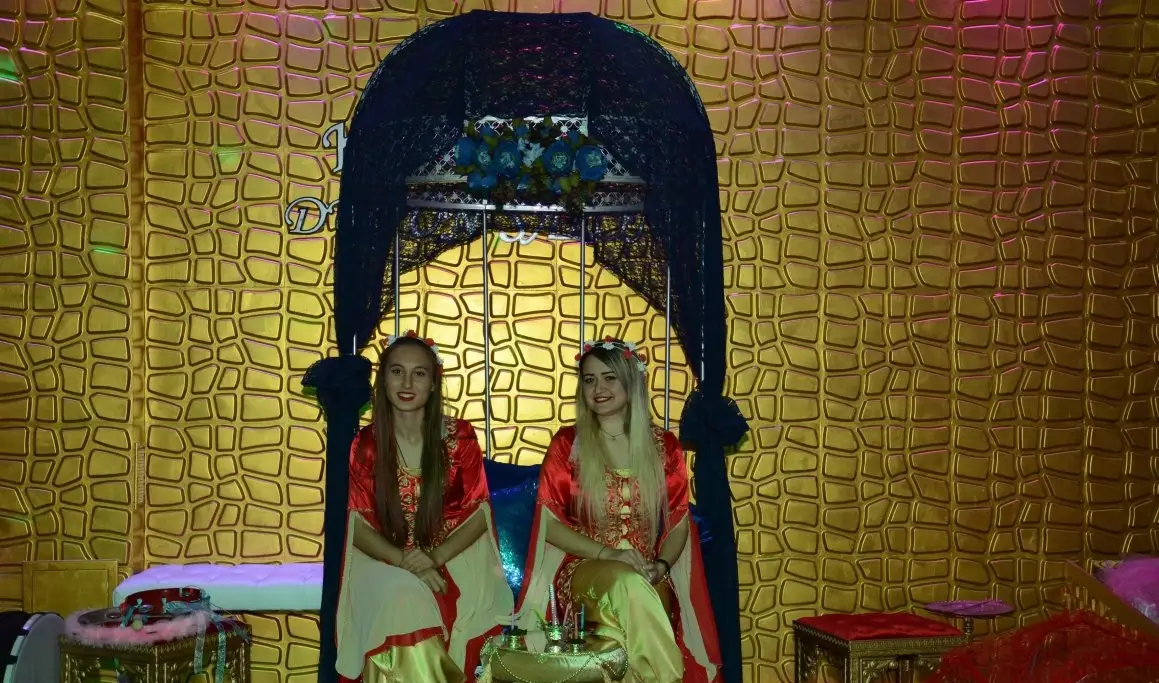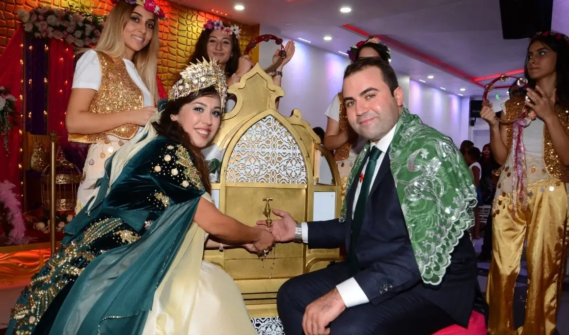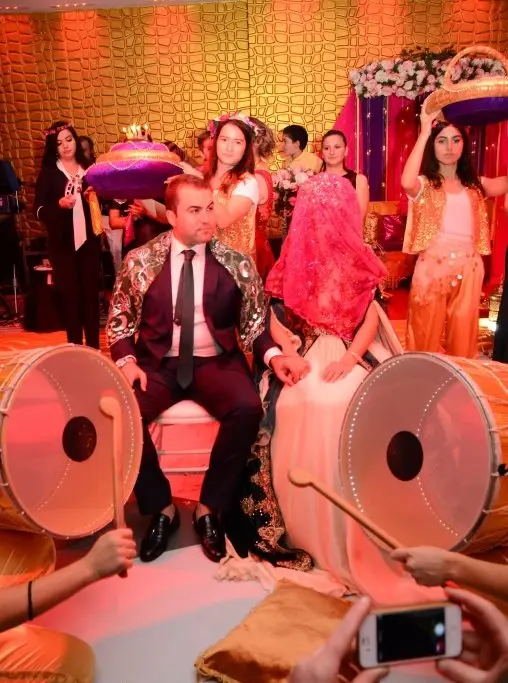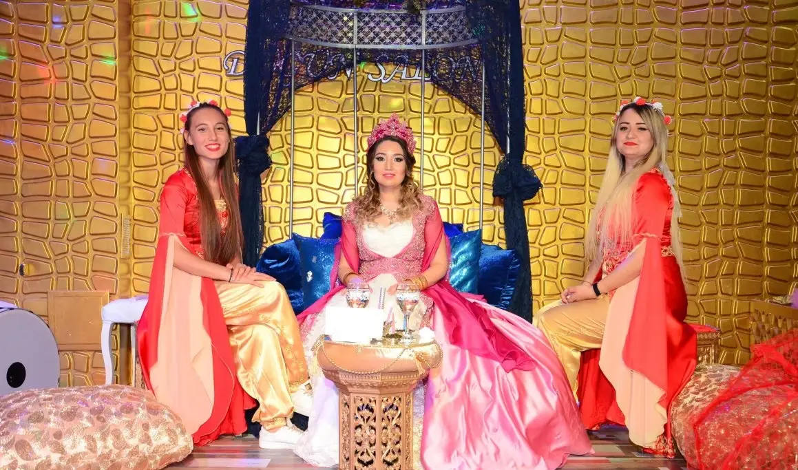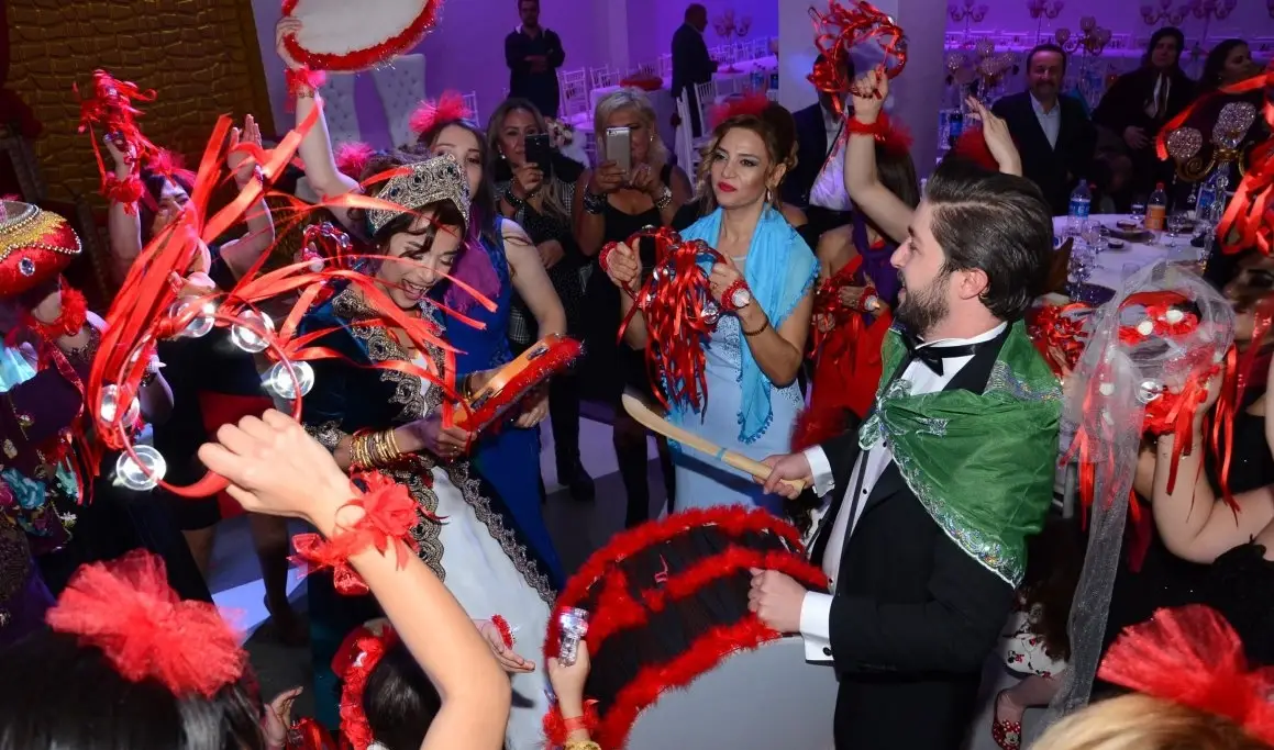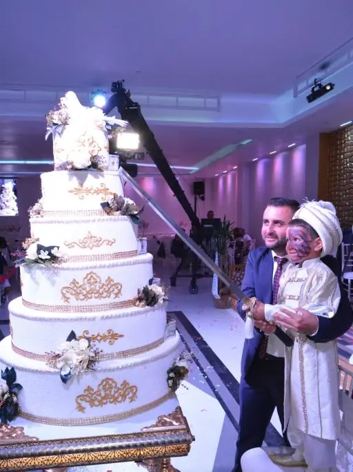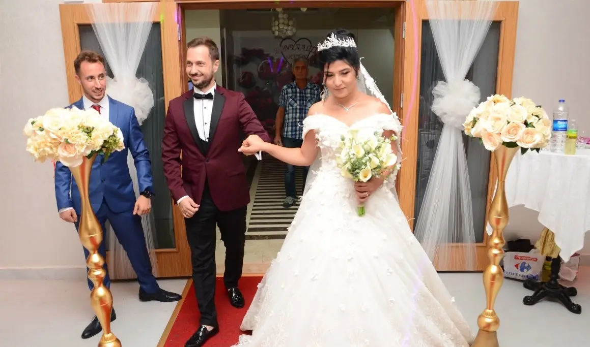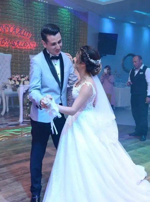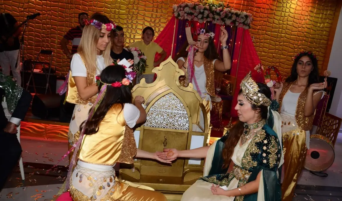 Beyaz ve gold renk uyumu ön plana çıkarılarak, yuvarlak masalar beyaz dantel işlemeli örtüler, altın pleksi suplalar ve kristal boncuklu şamdanlarla süslenmiştir. Beyaz tiffany sandalyeler kırmızı güllerle, gold vazo şeklindeki gelin yolu aksesuarları ve gold varaklı aynalarla dekorasyon tamamlanmıştır.