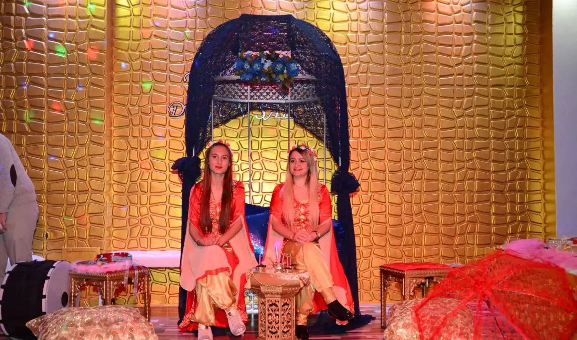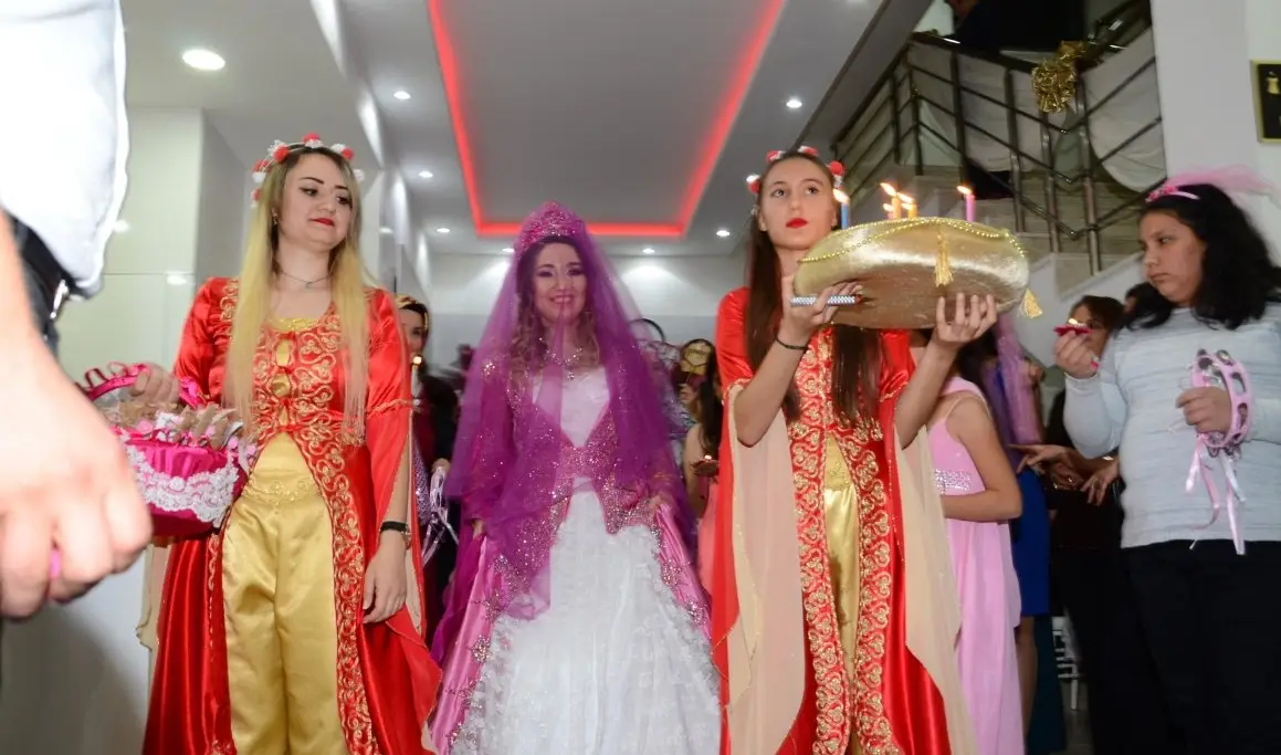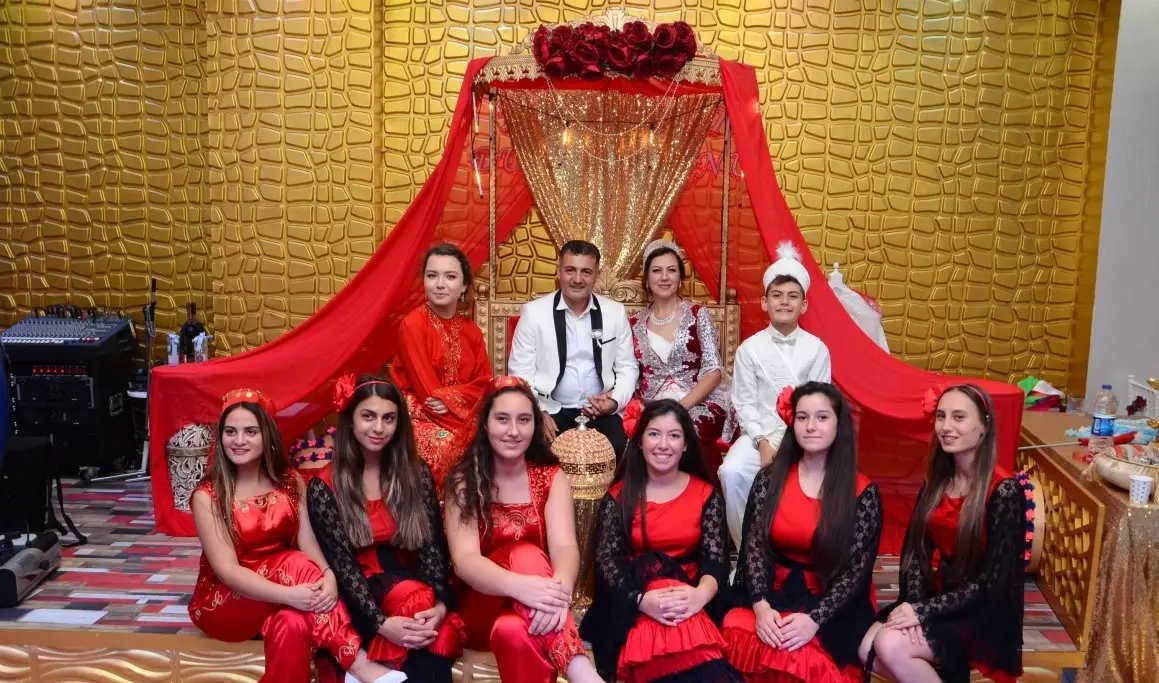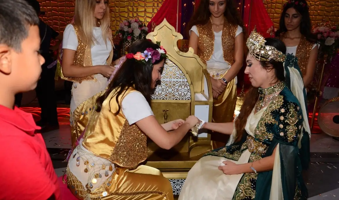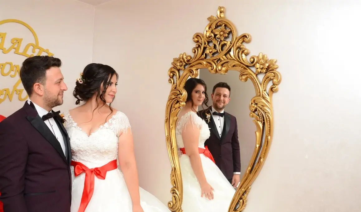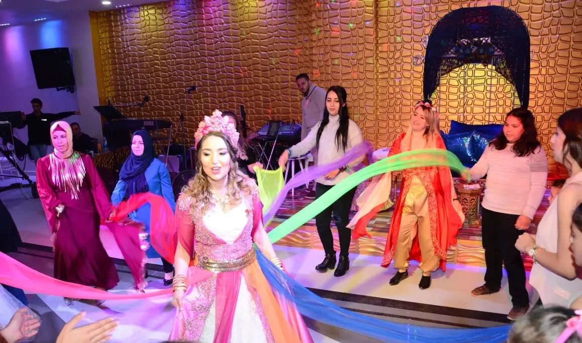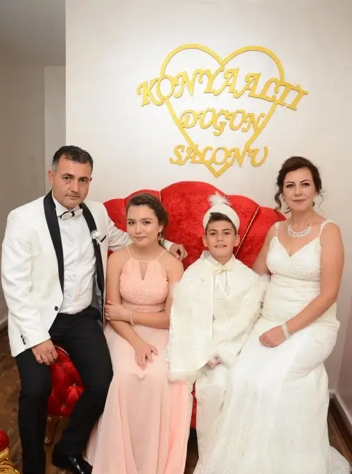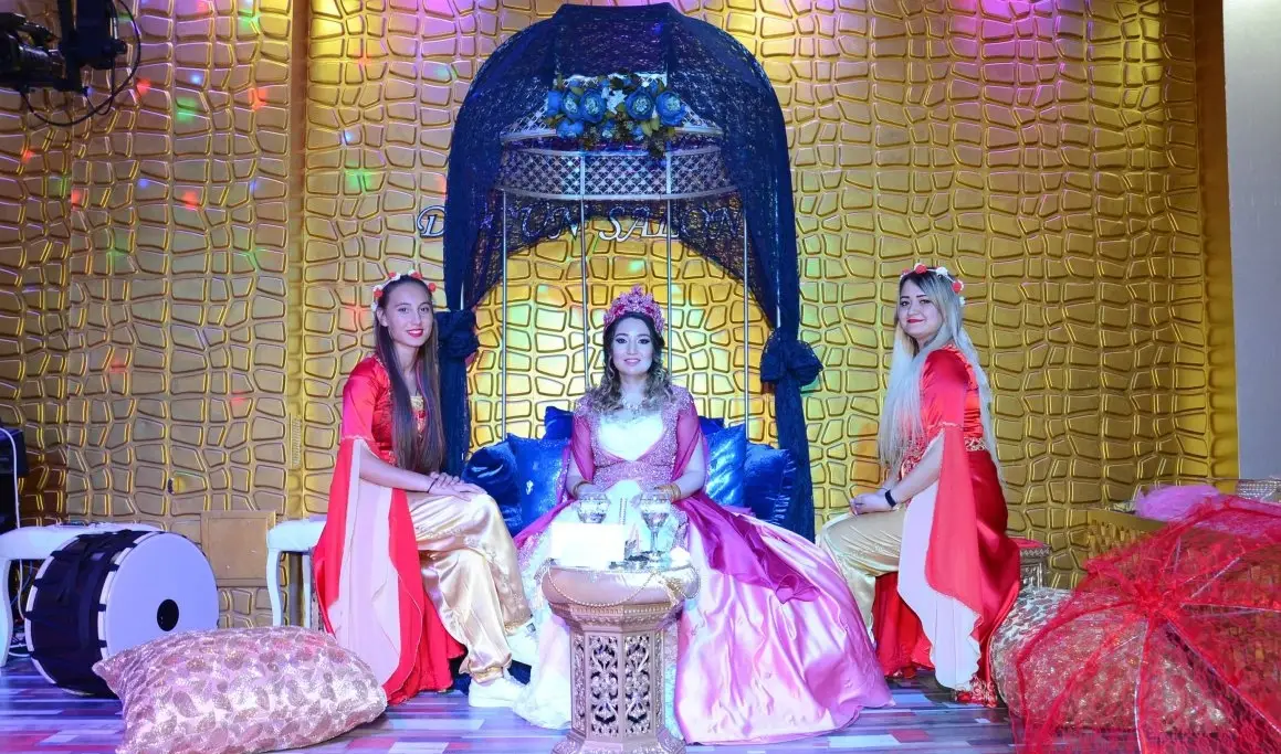Beyaz ve gold renk uyumu ön plana çıkarılarak, yuvarlak masalar beyaz dantel işlemeli örtüler, altın pleksi suplalar ve kristal boncuklu şamdanlarla süslenmiştir. Beyaz tiffany sandalyeler kırmızı güllerle, gold vazo şeklindeki gelin yolu aksesuarları ve gold varaklı aynalarla dekorasyon tamamlanmıştır.