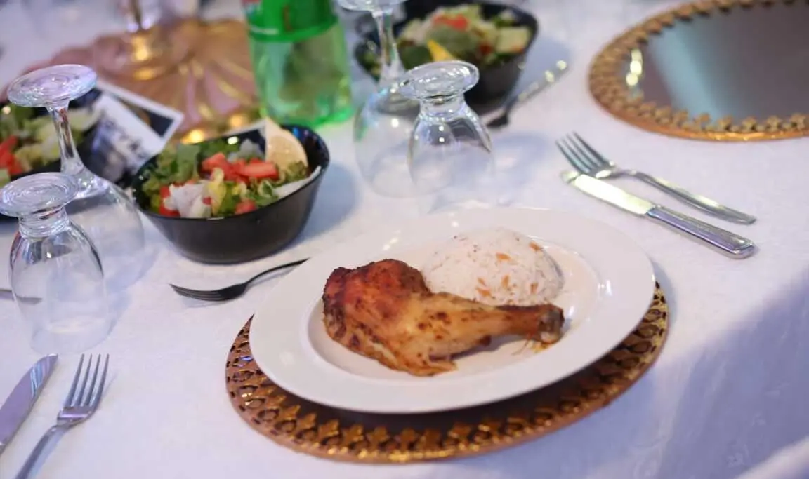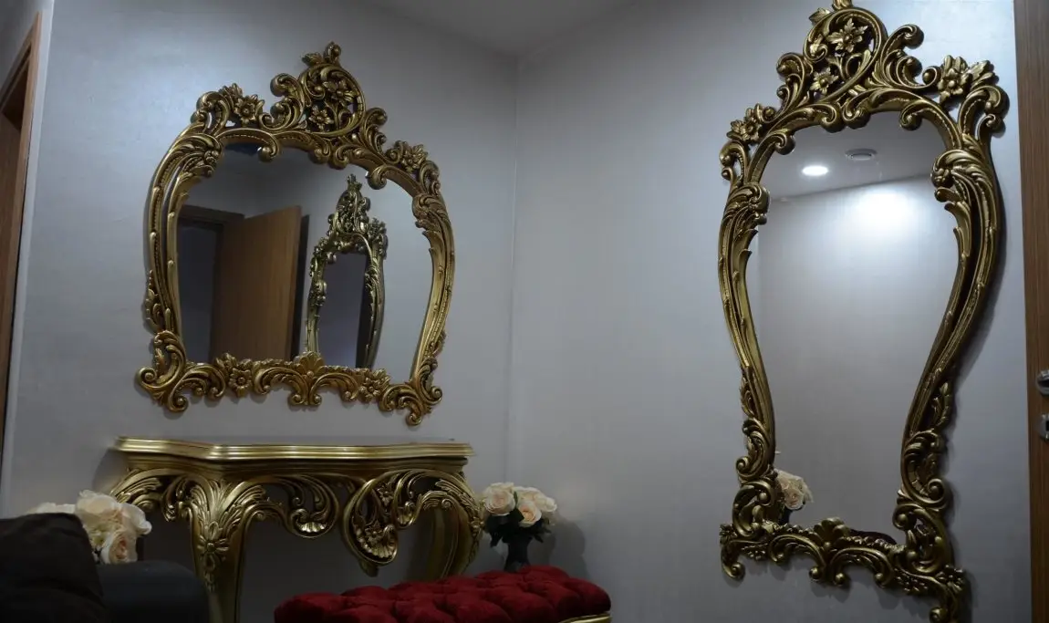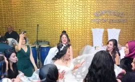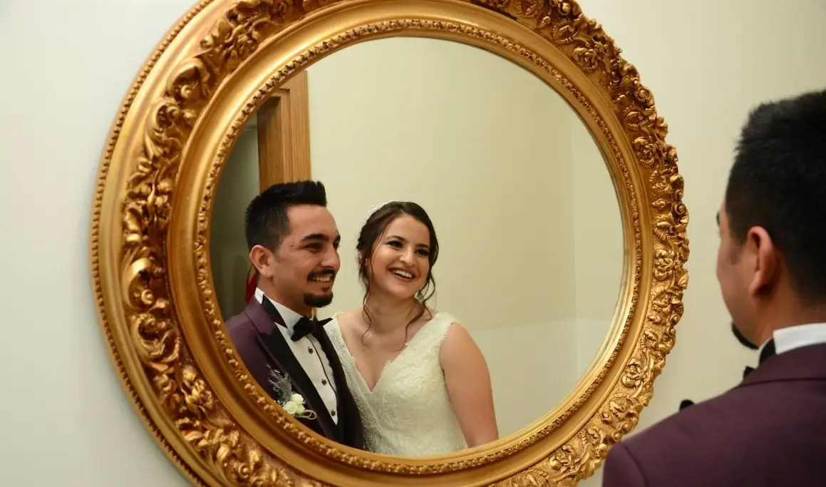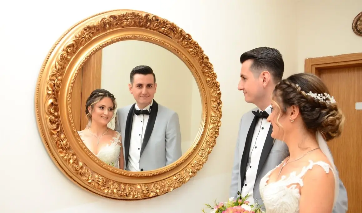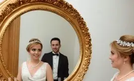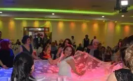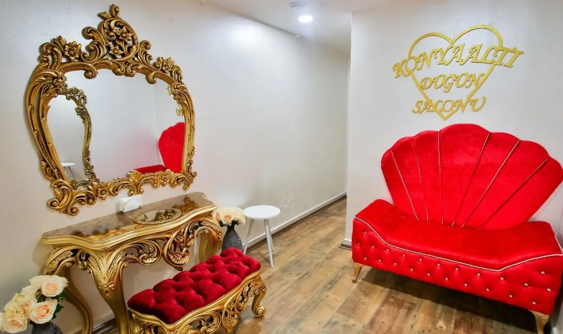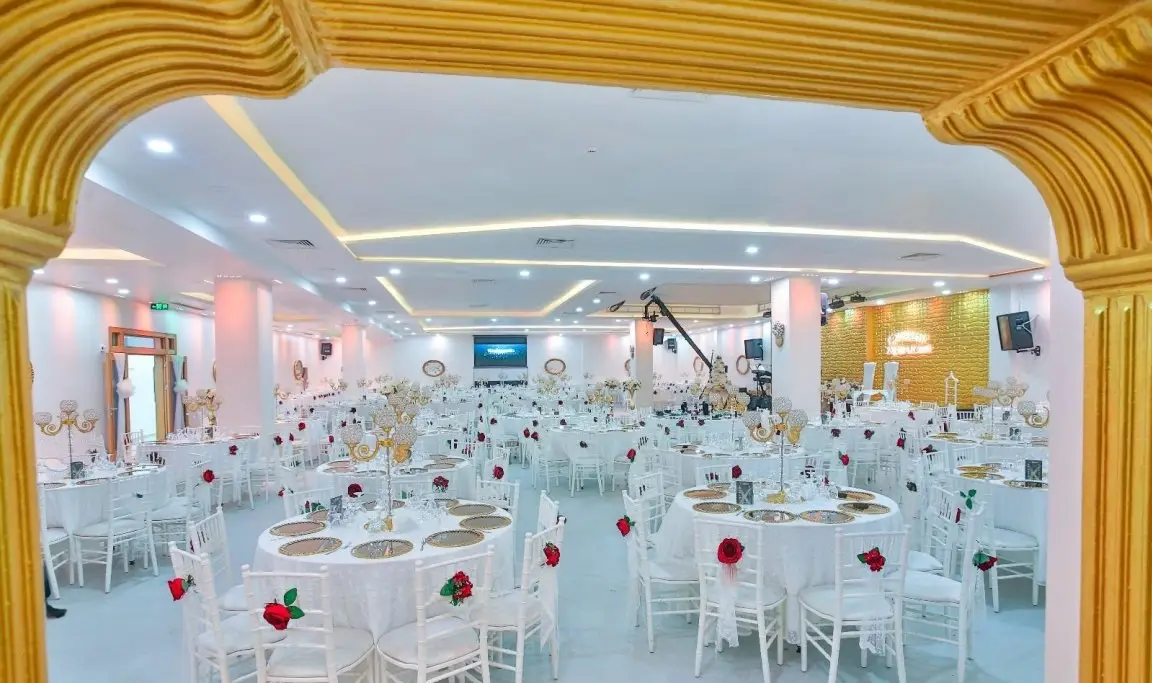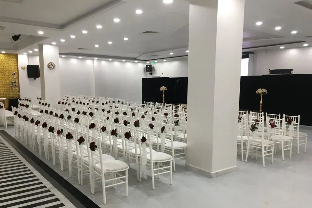 Salonumuz, beyaz ve gold rengin zarafetiyle bezenmiş, modern ve şık bir görünüşe sahiptir. Yuvarlak masaları beyaz dantel işlemeli örtüler, altın pleksi suplalar ve kristal boncuklu şamdanlar süslerken, beyaz tiffany sandalyelerimizi kırmızı güllerle hareketlendiriyoruz. Gold vazo şeklindeki gelin yolu aksesuarları ve gold varaklı aynalar, dekorasyonumuzun bütünlüğünü tamamlamaktadır.