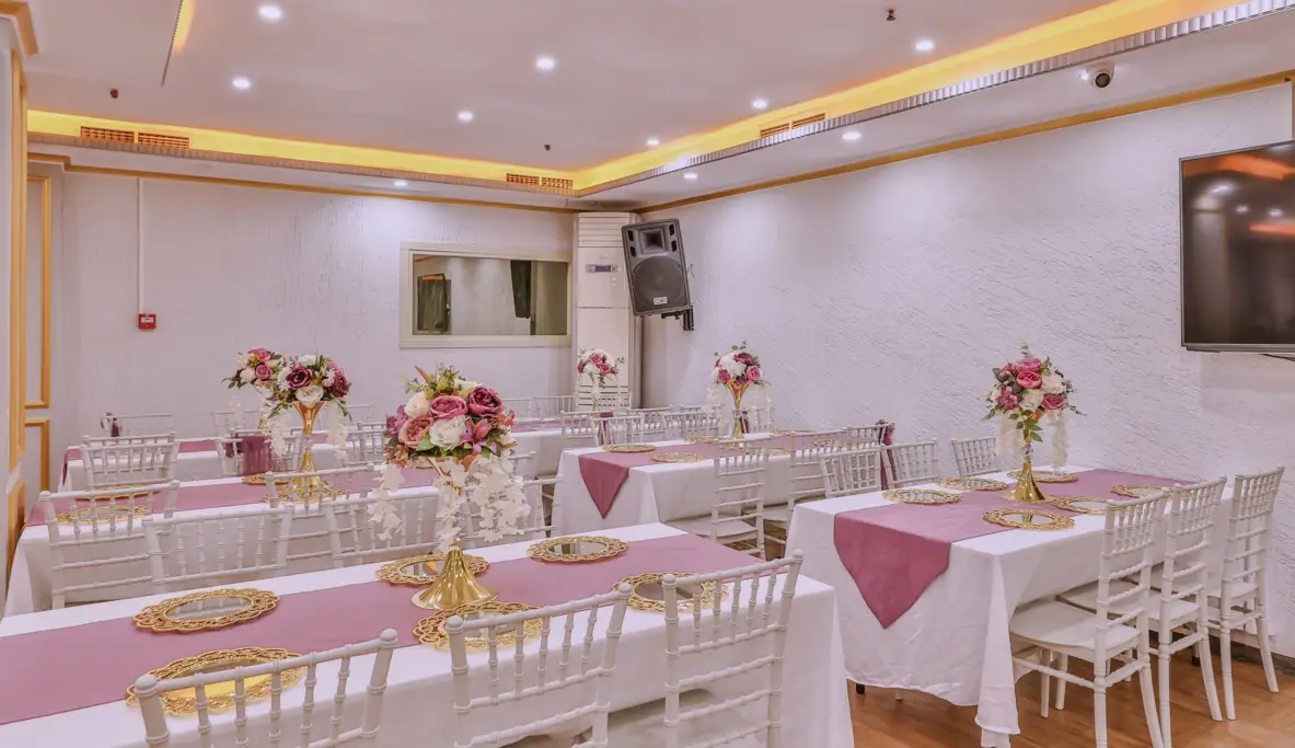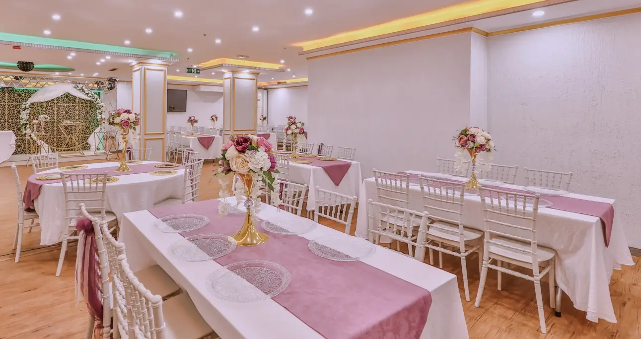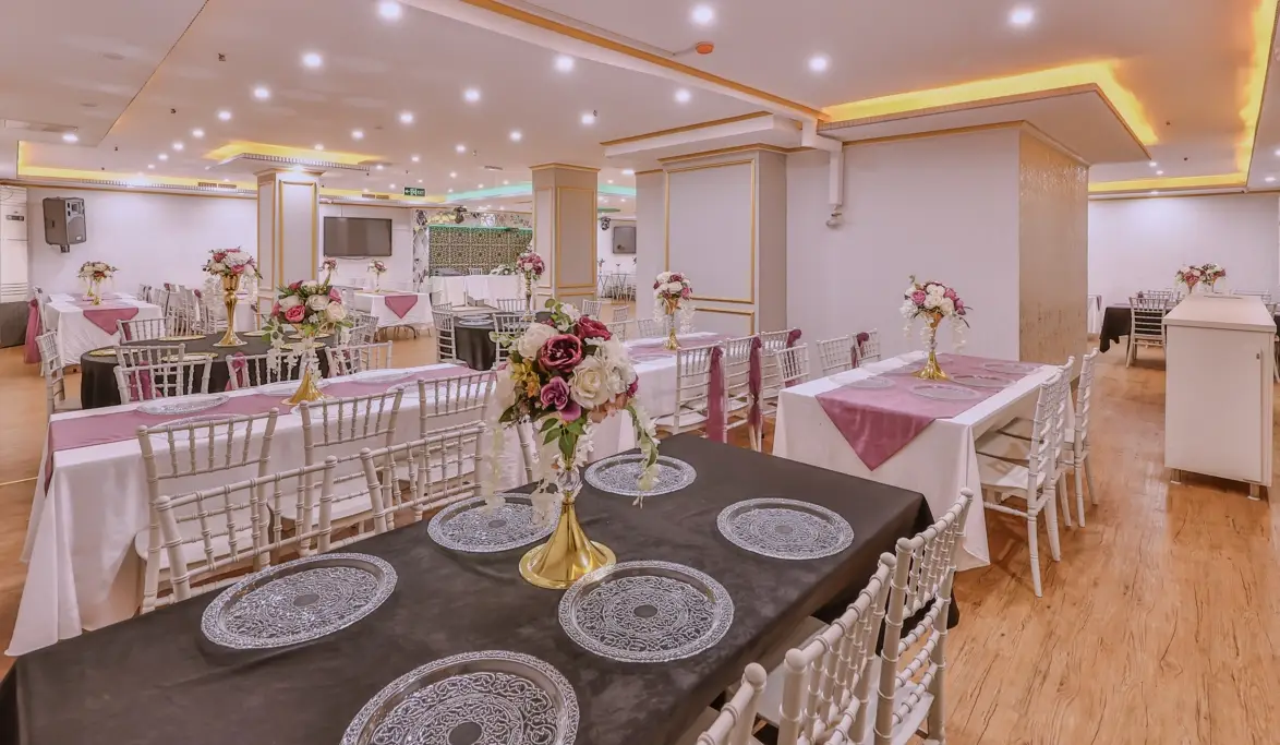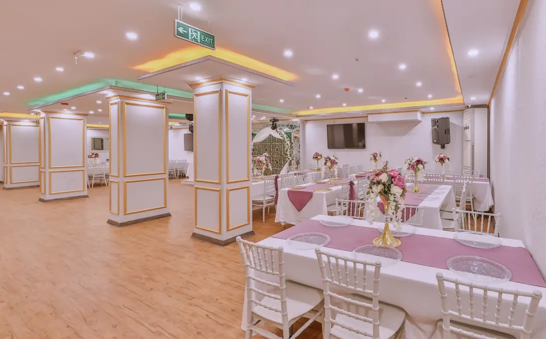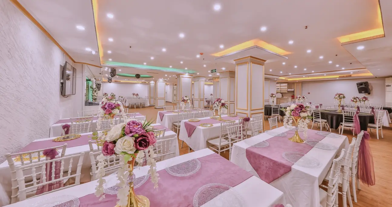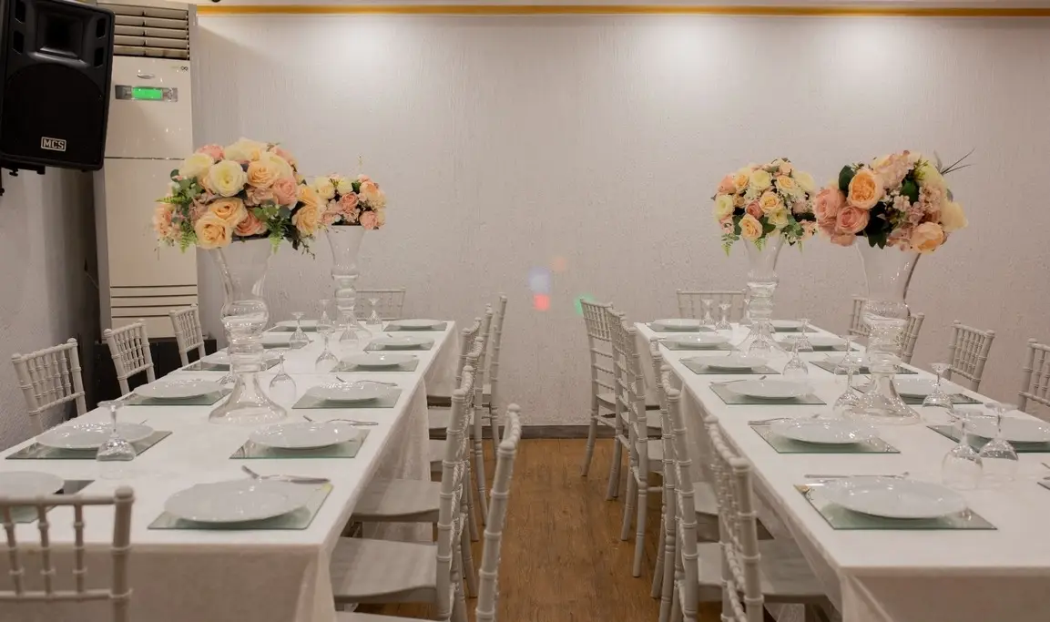 Beyazın saflığı ile zarafete bürünmüş mekanımızda, tiffany sandalyeler ve masa örtüleri başta olmak üzere, zarif gül buketleri ve aynalı suplalarla süslenmiş masa dizaynlarımızla davetlerinize estetik bir çerçeve kazandırıyoruz. Altın varak detaylarla hareket kattığımız dekorasyonumuz, özel günlerinizde sadelik ve şıklığı bir arada sunuyor.