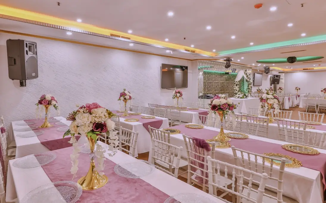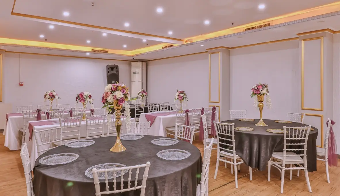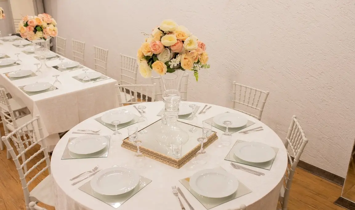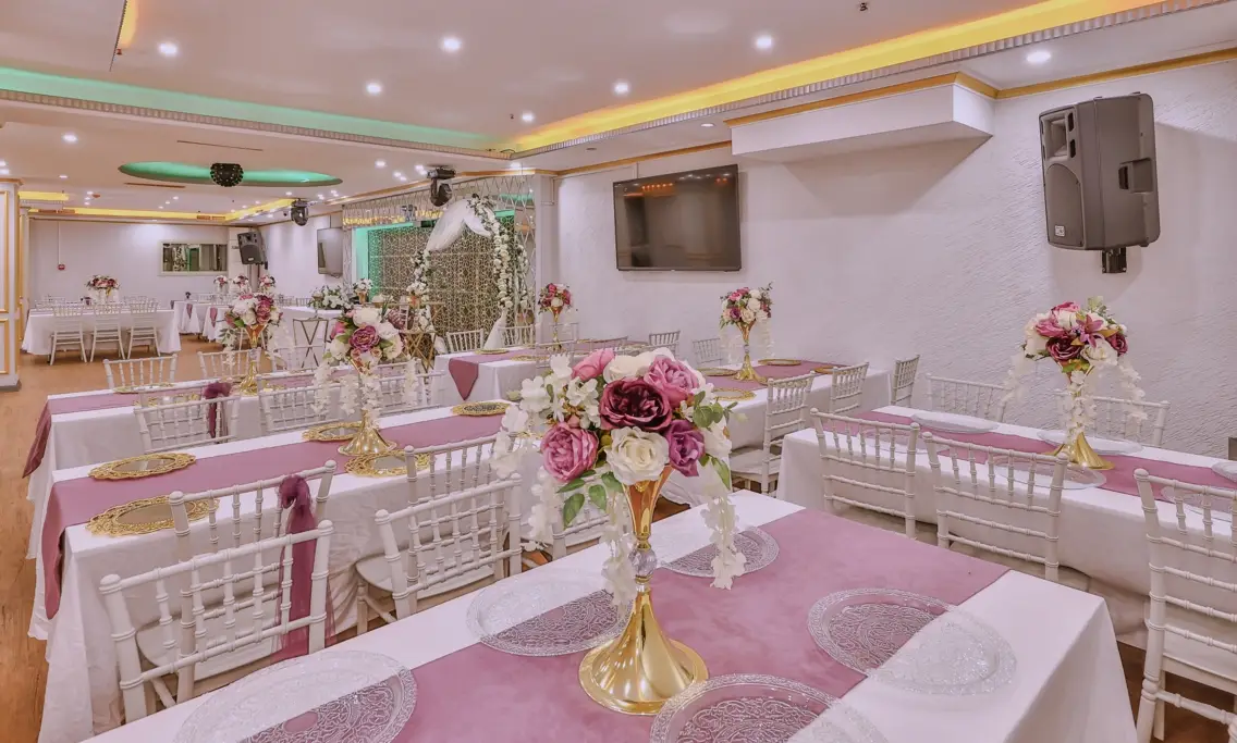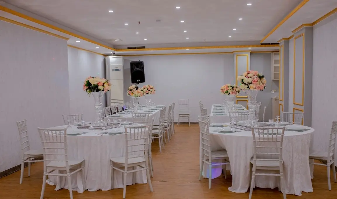 Beyazın saflığı ile zarafete bürünmüş mekanımızda, tiffany sandalyeler ve masa örtüleri başta olmak üzere, zarif gül buketleri ve aynalı suplalarla süslenmiş masa dizaynlarımızla davetlerinize estetik bir çerçeve kazandırıyoruz. Altın varak detaylarla hareket kattığımız dekorasyonumuz, özel günlerinizde sadelik ve şıklığı bir arada sunuyor.