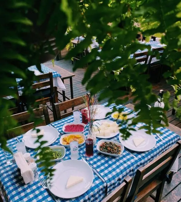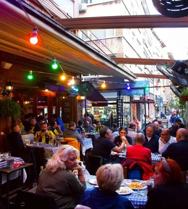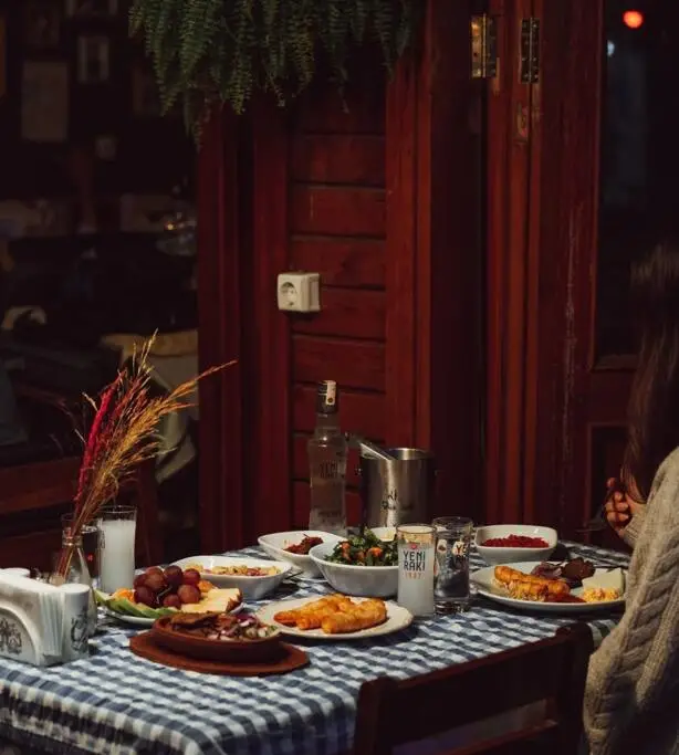 Yüksek tavanları, ferah yapısı ve ahşap dokusuyla dikkat çeken iç mekânımız, modern ve konforlu tasarımıyla evinizin sıcaklığını aratmıyor. Geleneksel meyhane kültürünün çağdaş detaylarla harmanlandığı mekanımız, benzersiz anlarınızı unutulmaz kılmak için özel olarak tasarlandı. Zarif ahşap masalar, nostaljik kareli masa örtüleriyle süslenmiş olup, şık ve samimi bir ortam sunuyor.