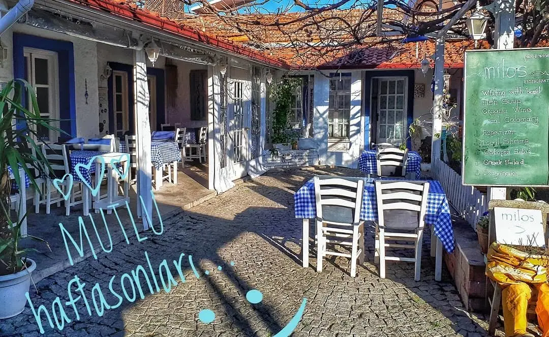 Milos Balık, İzmir'in kristal maviliklerle bezeli Seferihisar ilçesinde, balıkçı kasabasının sıcaklığını ve samimiyetini yansıtan bir mekân. Begonvillerin rengarenk süslediği, mavi ağırlıklı dekorasyonu ile kendinizi Ege'nin kalbinde hissedeceğiniz bu özel yerde, sevdiklerinizle bir araya gelmenin ayrıcalığını yaşayacaksınız. Nikâh, doğum günü gibi özel günlerinizi burada kutlarken, anılarınıza eşlik edecek harika yemekler tadabilir, güleryüzlü servis ekibimizin kusursuz hizmetiyle her detayın keyfine varabilirsiniz. Hijyen ve insan sağlığına verdiğimiz önemle, gönül rahatlığıyla yemeğinizi yiyebilirsiniz. Eğer aradığınız lezzet ve atmosferi Milos Balık'ta bulduysanız, yemek kutlamasını benzersiz tatlarla taçlandırmak için sizi bir tadım yapmaya davet ediyoruz. Lakerda, soslu hamsi gibi Ege lezzetlerinden taze balıklara, fırında helva veya damla sakızlı dondurmaya uzanan geniş menümüzle, kutlamanızı unutulmaz kılacak tatlar sunuyoruz. Bizimle iletişime geçmek ise bir tık kadar yakınınızda!
