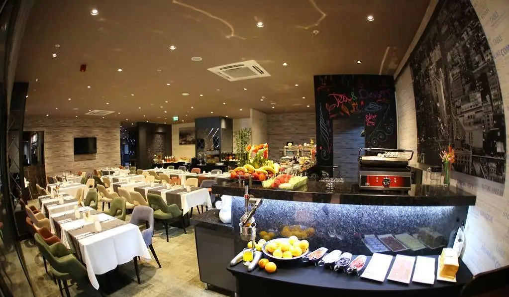 Evet, Namlı Restaurant zarif bir şekilde tasarlanmış kapalı bir salondan ve kameralı ve şehir manzarasına sahip geniş bir etkinlik alanından oluşmaktadır.