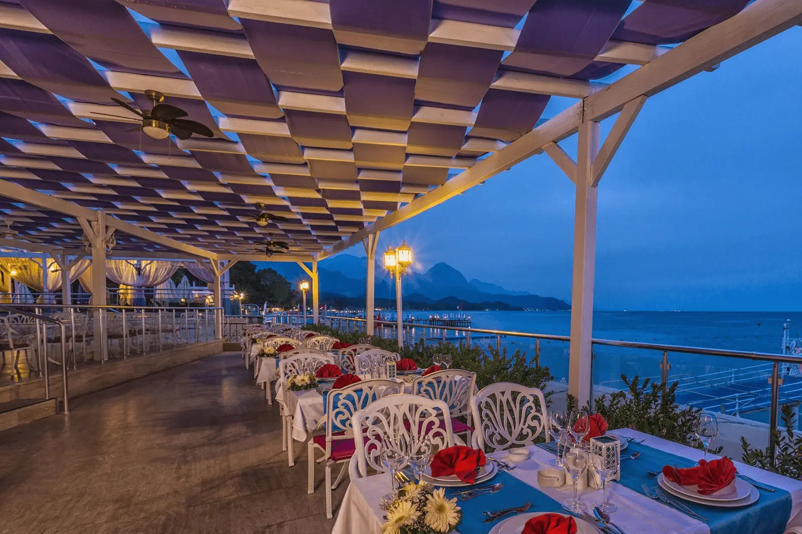 Kahvaltı sabah 7:00-10:30, öğle yemeği 12:30-14:30, akşam yemeği 19:00-21:30 ve gece yemeği 00:00-01:00 arasında açık büfe / self servis olarak sunuluyor.