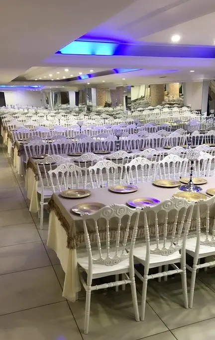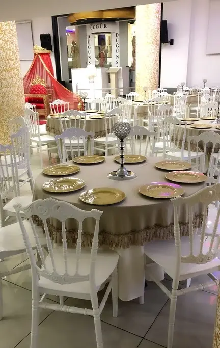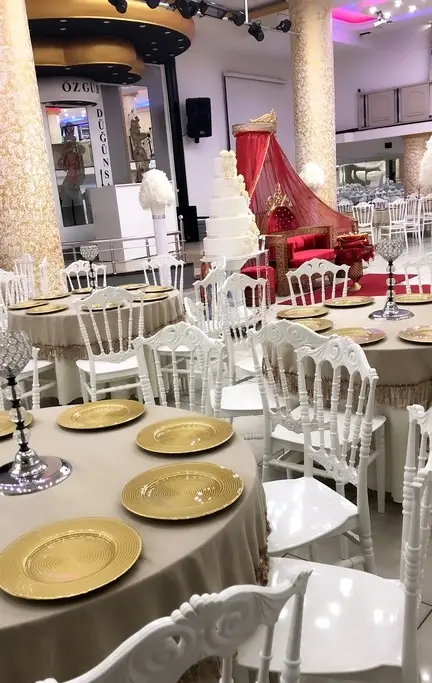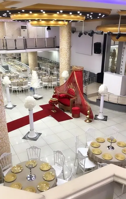 Düğün salonumuz, şık dekorasyonu ve konforunuza yönelik detaylarıyla öne çıkıyor. Modern tasarımlı yuvarlak masalarımız ve tiffany sandalyelerimizle, estetiği ve rahatlığı bir arada sunuyoruz. Krem ve pudra rengi masa düzenlemelerimizle görsel bir şölen yaratıyoruz. Gelin odası, bebek odası ve mescit alanlarımızla da ihtiyaç duyulan her detayı düşünüyoruz.
