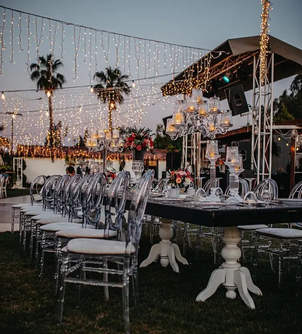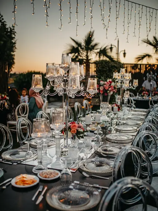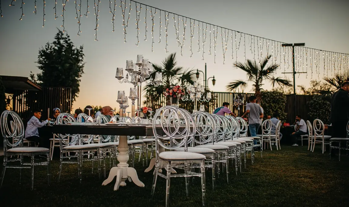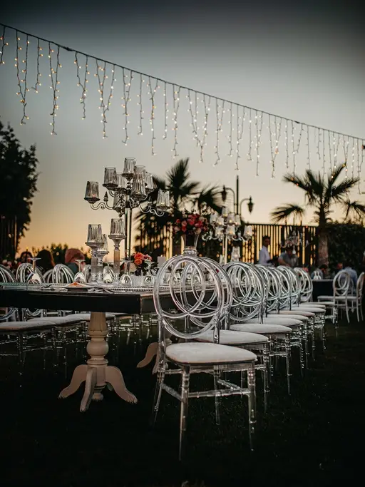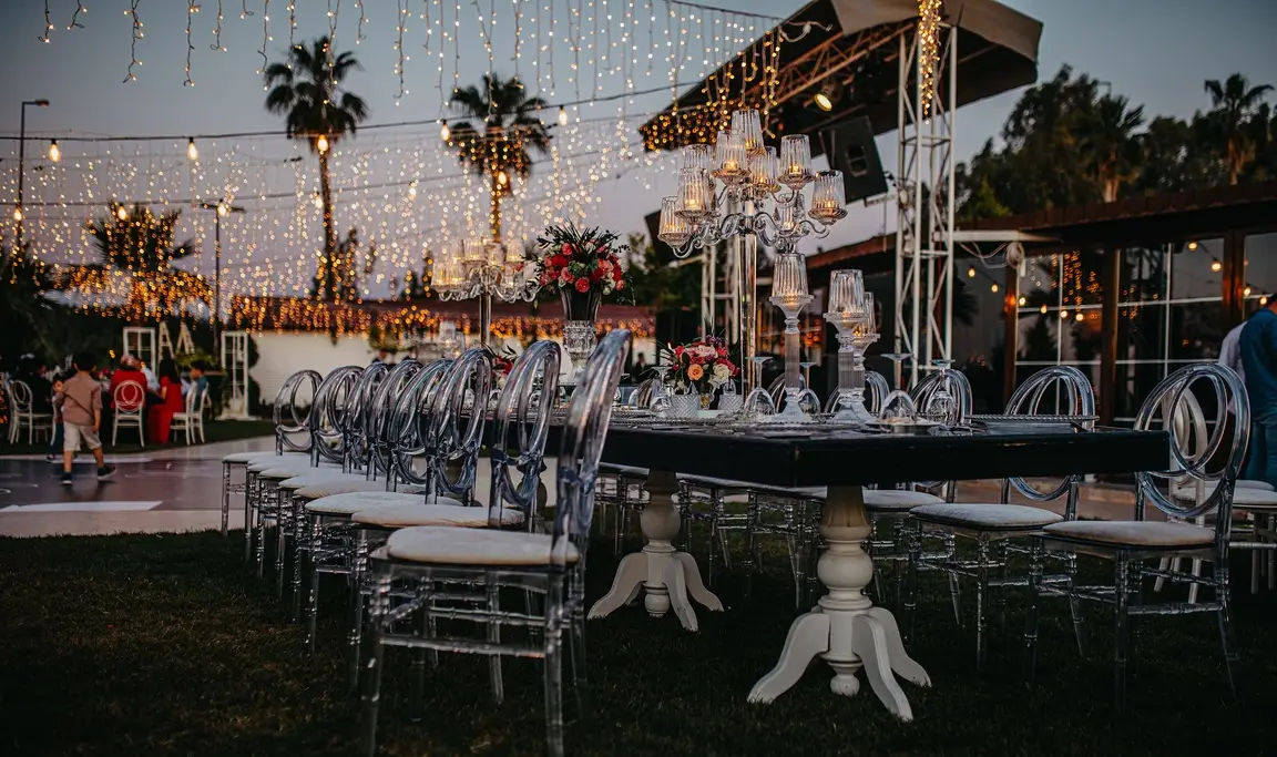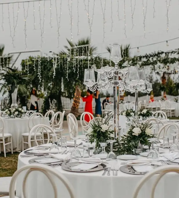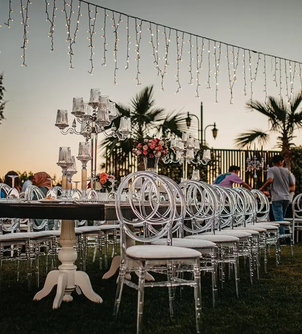 Rustik ve klasik tasarımların modernle birleştirildiği, beyaz masalar, şeffaf ya da beyaz napolyon sırtlı sandalyeler kullanılarak yapılan dekorasyon.