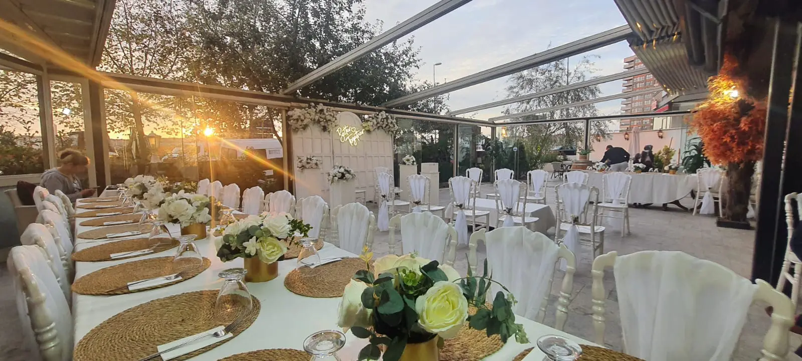 Mekanımızda açık ve kapalı olmak üzere 2 adet davet alanıyla çiftleri karşılıyoruz: ●kapalı davet alanımıza 200 kişI davet edebilirsiniz. ●açık davet alanımızsa butik organizasyonlar Için ideal olacaktır. Burada 50 kişilik nişan törenleri düzenleyebiliyoruz. ●açık alanımızda açılır kapanır tavan özelliği de yer aldığından sizi gökyüzü manzarasının altında ağırlayabiliyoruz.